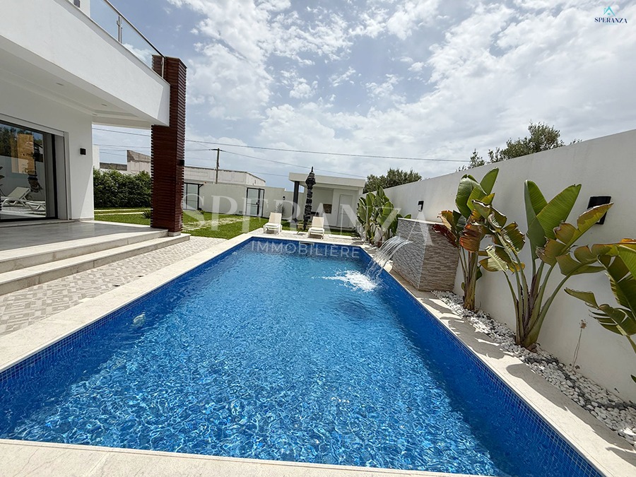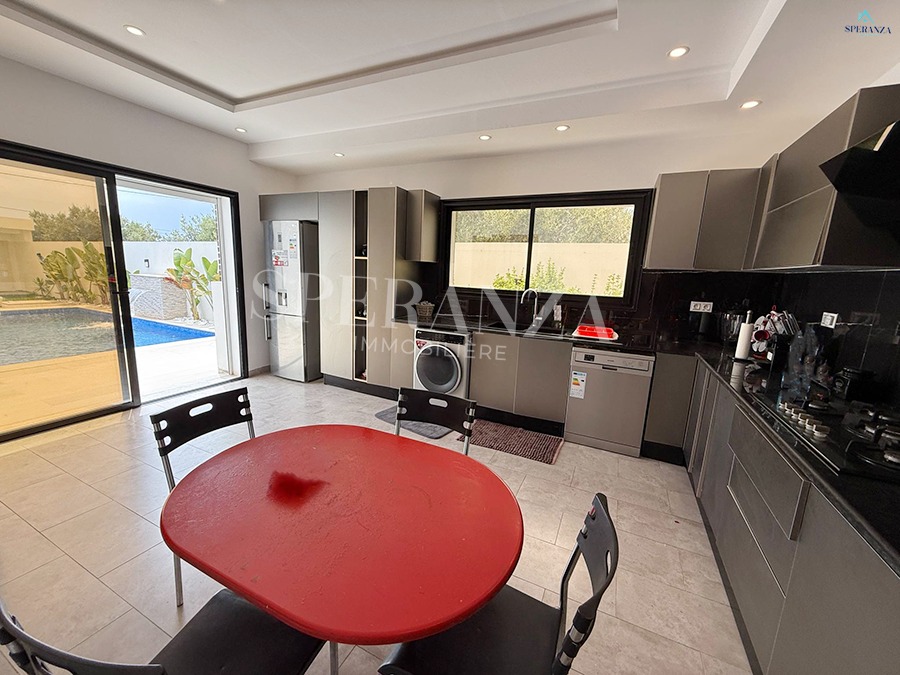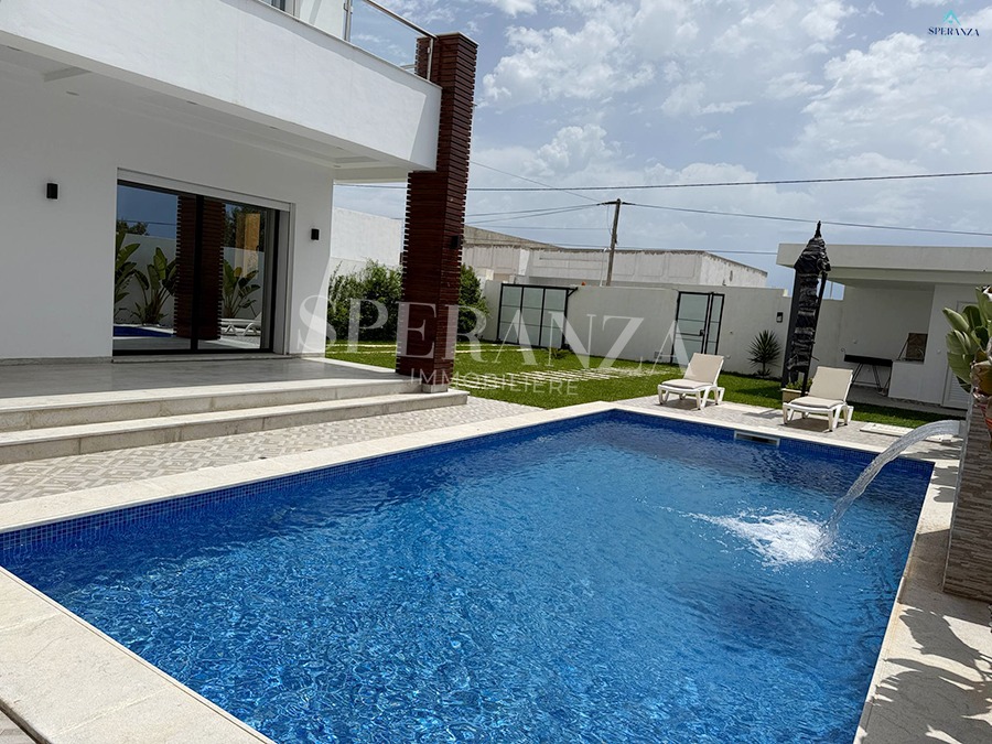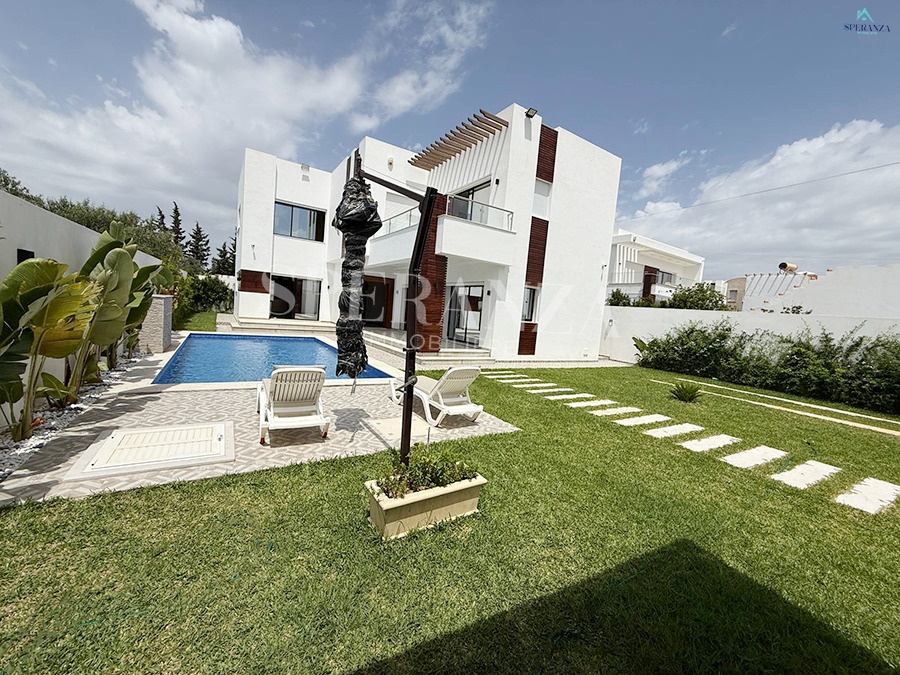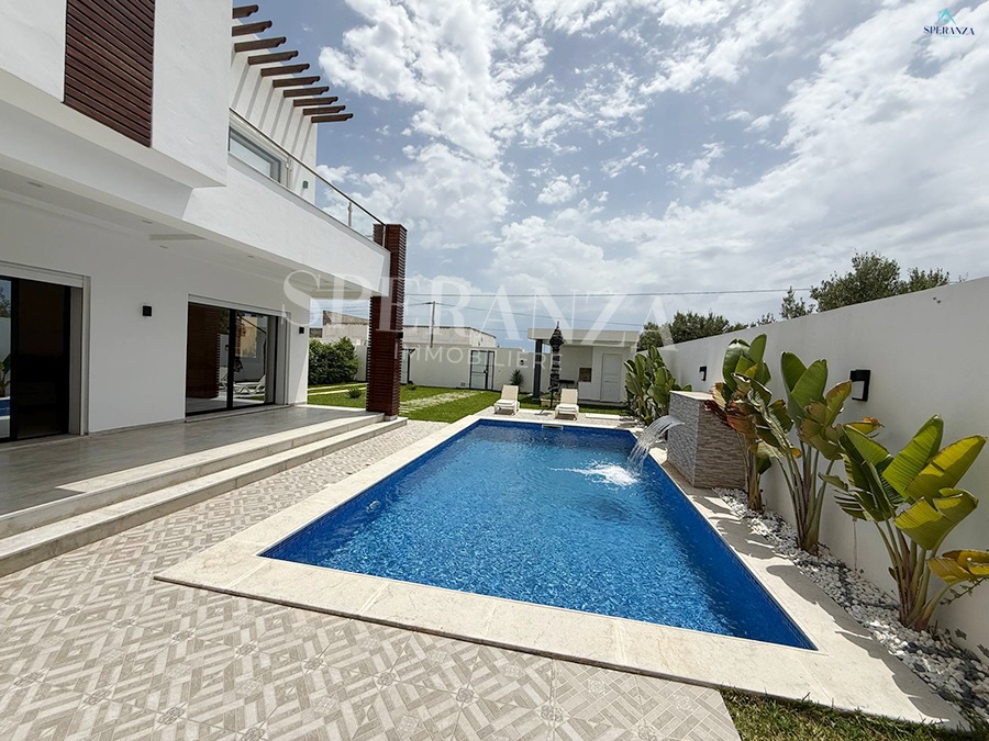 Speranza Immobilière Hammamet proudly offers you a Modern S+3 Holiday Villa with Pool for Rent in Hammamet Sud, located in the serene and secure area of Sidi Hamed. This stylish and spacious villa is ideal for a relaxing vacation, featuring a total area of 600 m² and 350 m² of living space. The ground floor welcomes you with a lush green garden, multiple lounging areas, and a private pool. Inside, you’ll find a bright living room with large openings, a well-equipped kitchen with generous storage, one bedroom, and a guest bathroom.