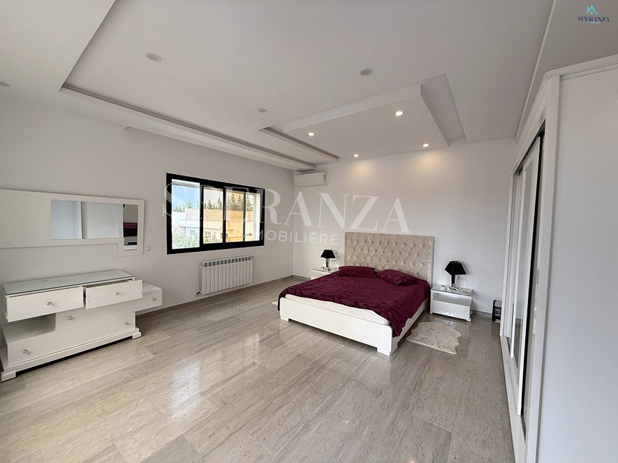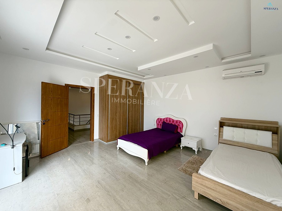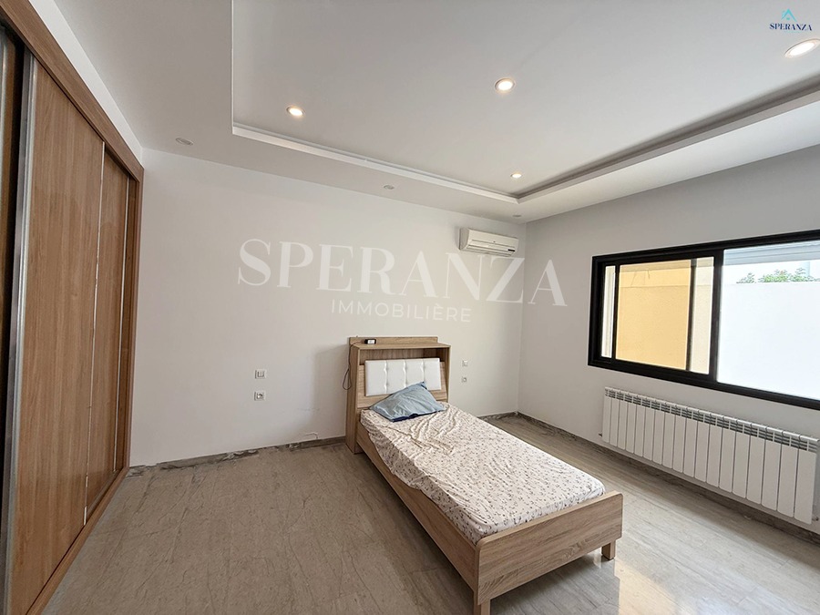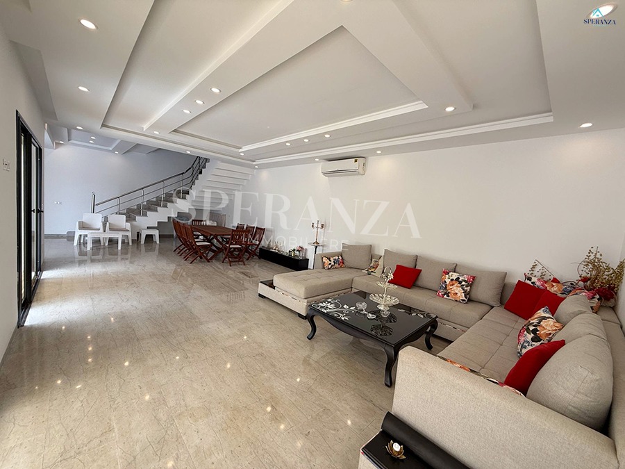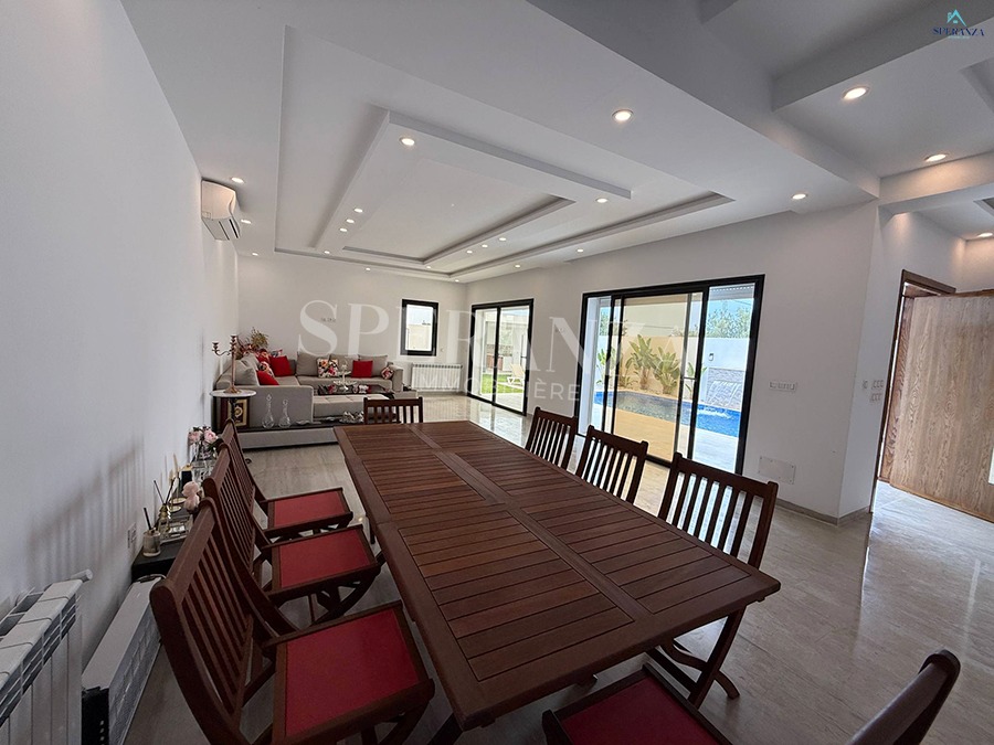 Speranza Immobilière Hammamet proudly offers you a Modern S+3 Holiday Villa with Pool for Rent in Hammamet Sud, located in the serene and secure area of Sidi Hamed. This stylish and spacious villa is ideal for a relaxing vacation, featuring a total area of 600 m² and 350 m² of living space. The ground floor welcomes you with a lush green garden, multiple lounging areas, and a private pool. Inside, you’ll find a bright living room with large openings, a well-equipped kitchen with generous storage, one bedroom, and a guest bathroom.