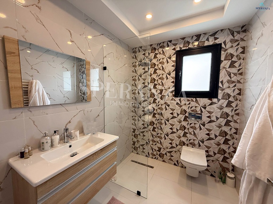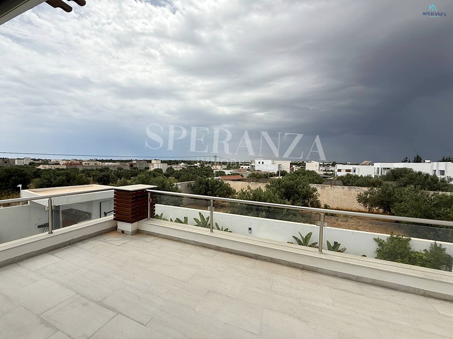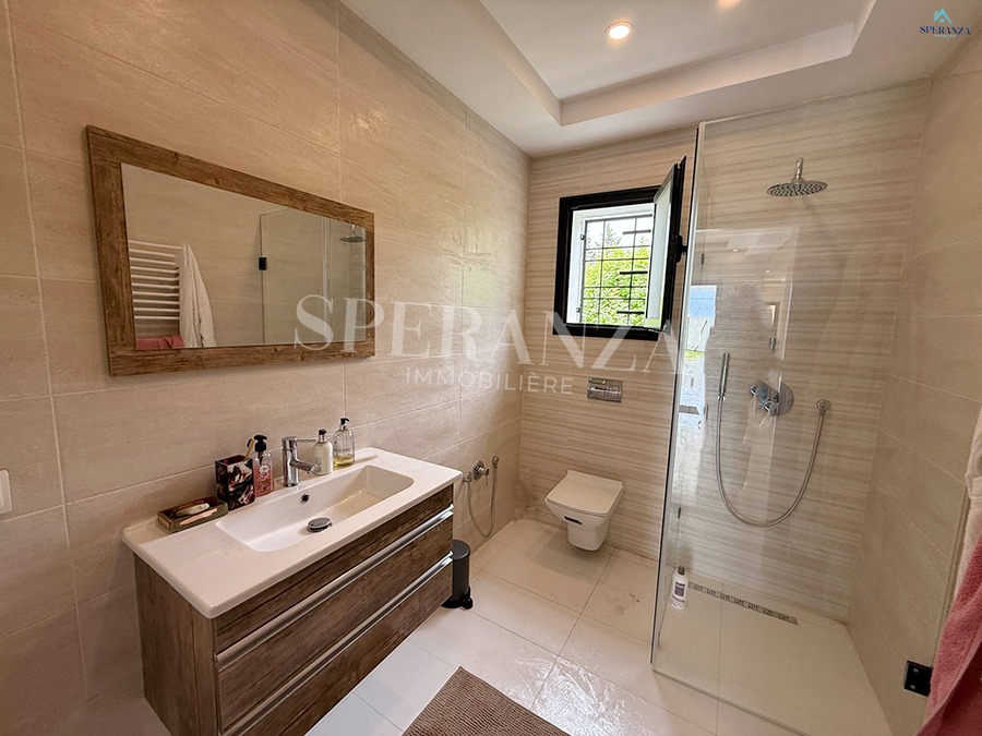 The upper level includes a master suite, another bedroom, a bathroom, a lovely terrace, and a carport. This villa comes with modern amenities such as city gas, central heating, and air conditioning, ensuring year-round comfort. Whether you’re planning a short getaway or an extended stay, this property is perfect for your holidays. The price varies depending on the rental period. For more information, contact Speranza Immobilière Hammamet at ☎️ 23555199 / 50552450 / 51970200.