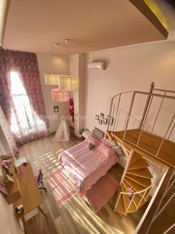 On the ground floor, you’ll find a bright and spacious living room with direct access to the lush garden and private swimming pool, a cozy living space, a fully equipped open kitchen, and a service room. The upper floor offers three suites, including a master suite and two junior suites for added comfort and privacy. The second floor boasts a private cinema room and a large terrace with breathtaking open views. The property also includes a garage with space for up to four vehicles.