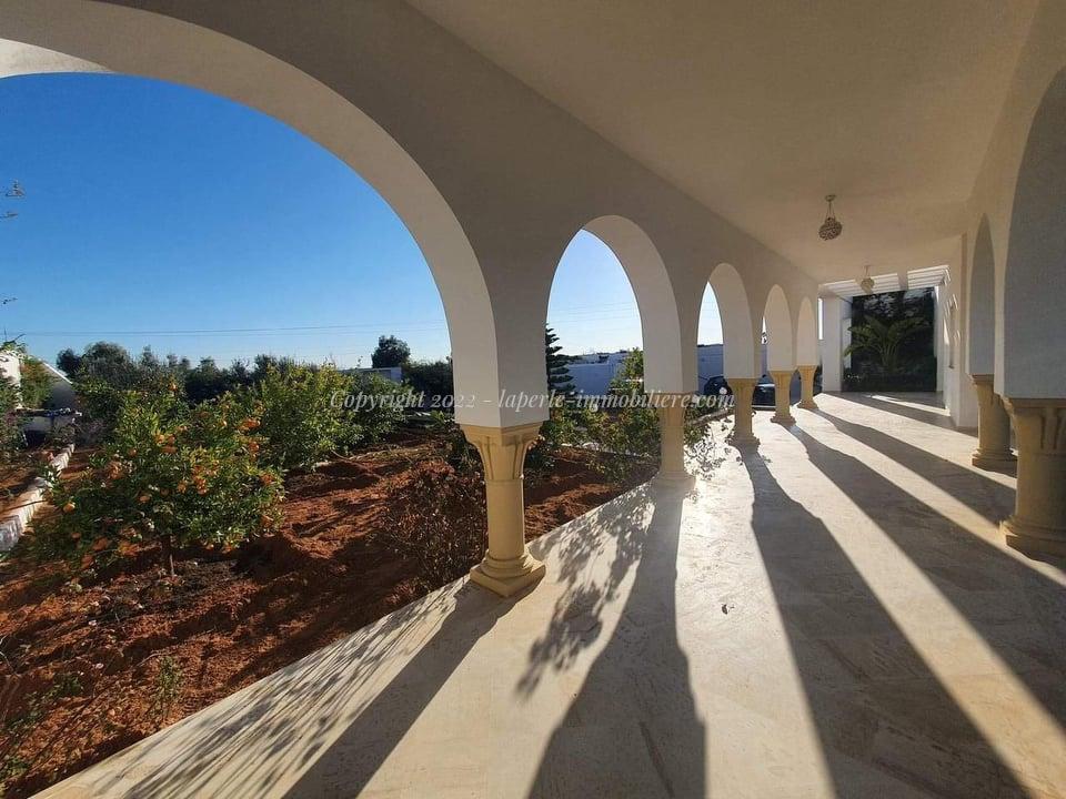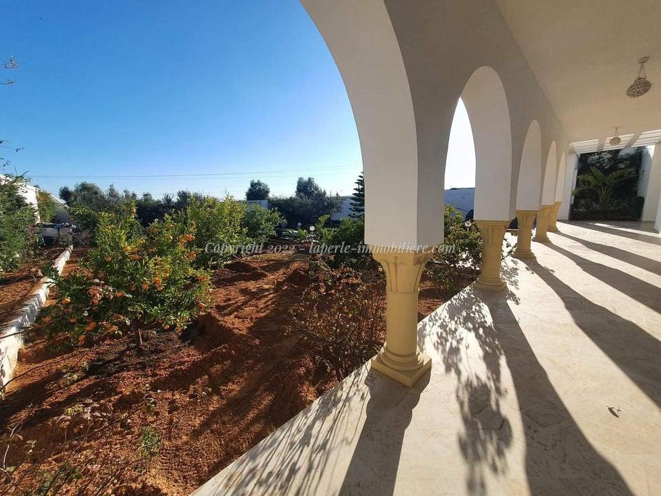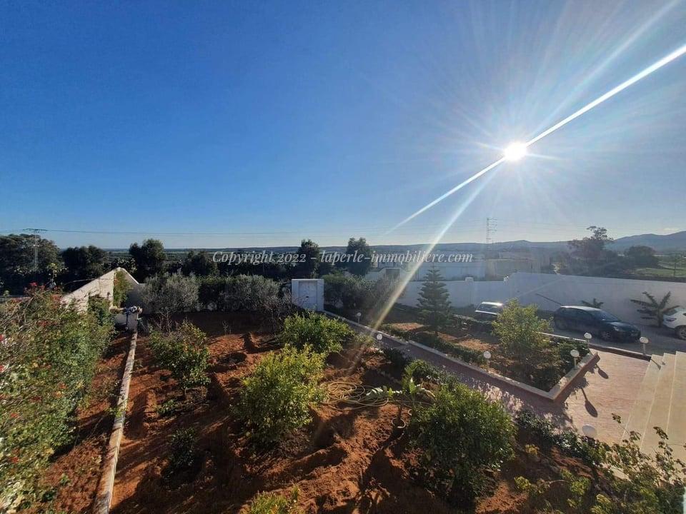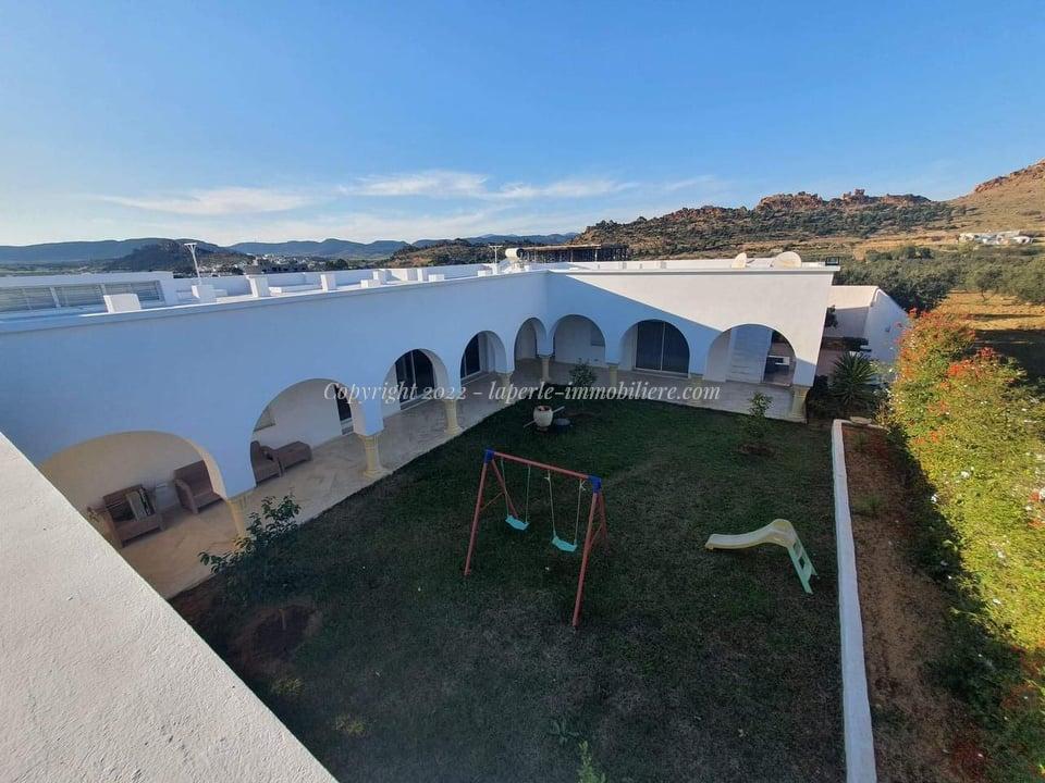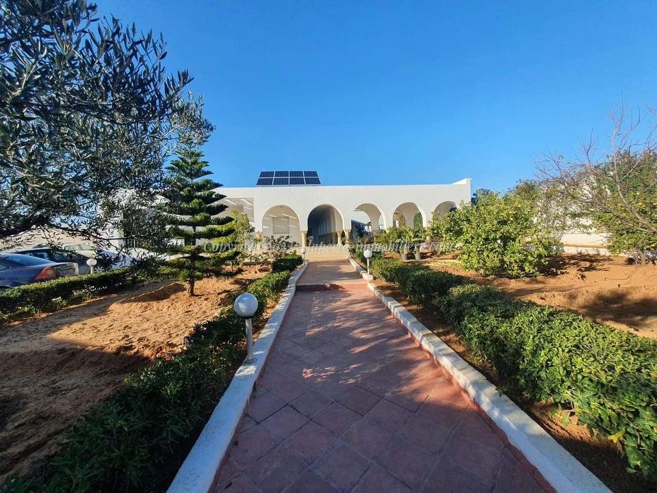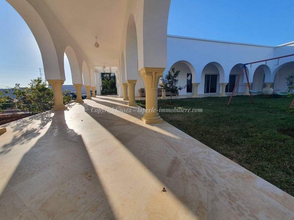 La Perle Immobilière offers a charming villa for sale in Monchar, just 10 minutes from Hammamet, located on the main road with excellent surroundings. This spacious property sits on a 1100 m² plot with 420 m² of living space, featuring two suites, two additional bedrooms, a fully equipped kitchen, two bathrooms with showers, a guest toilet, and a terrace.