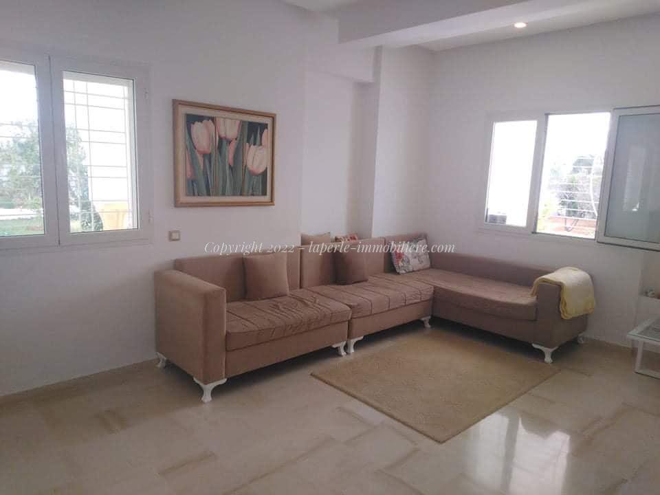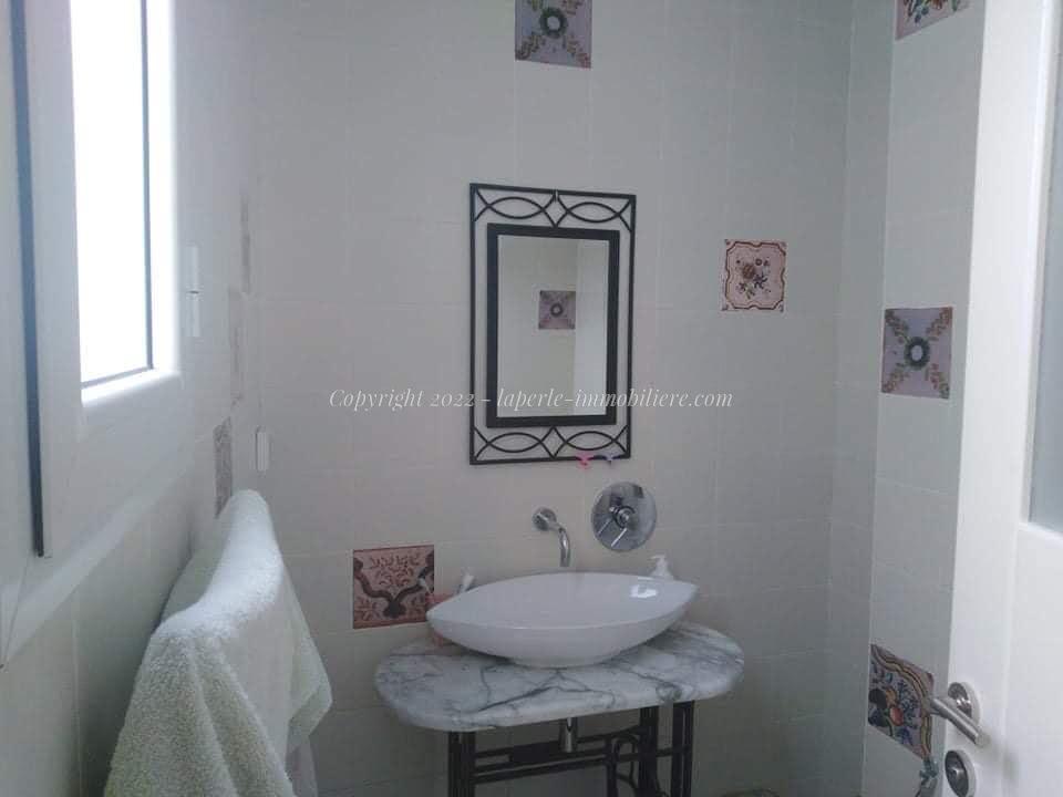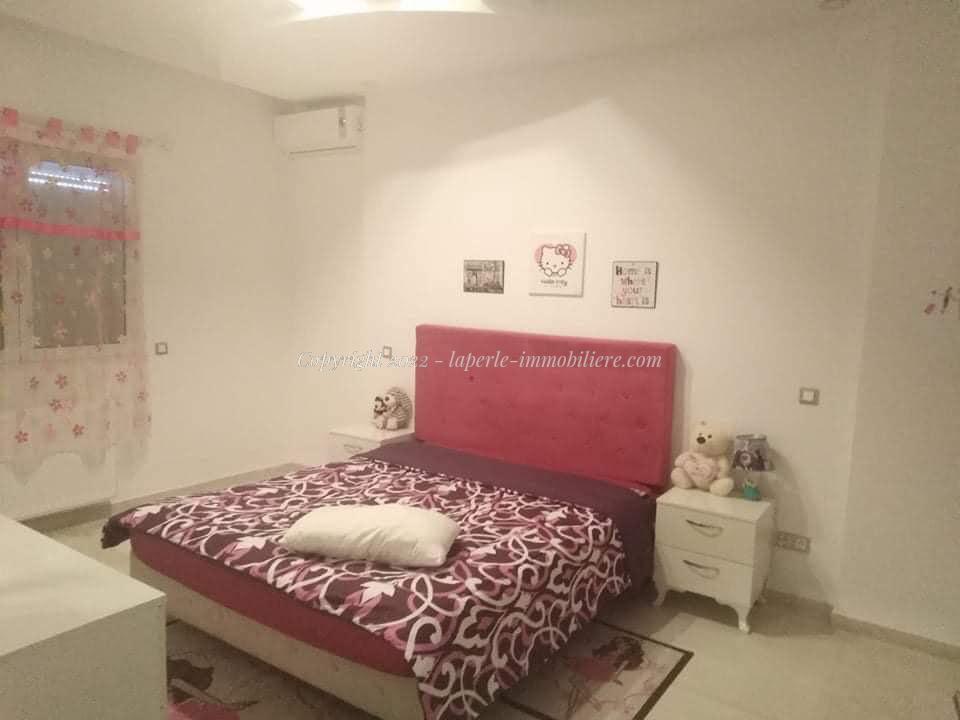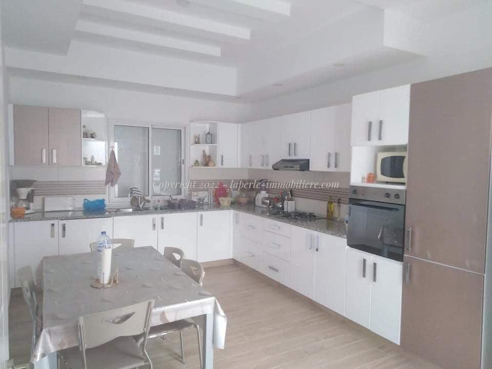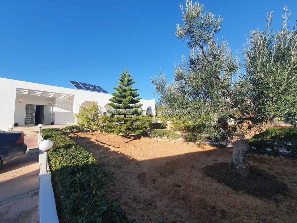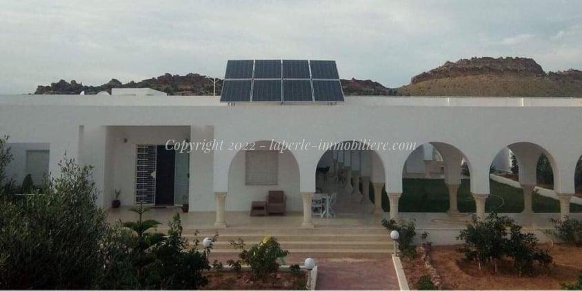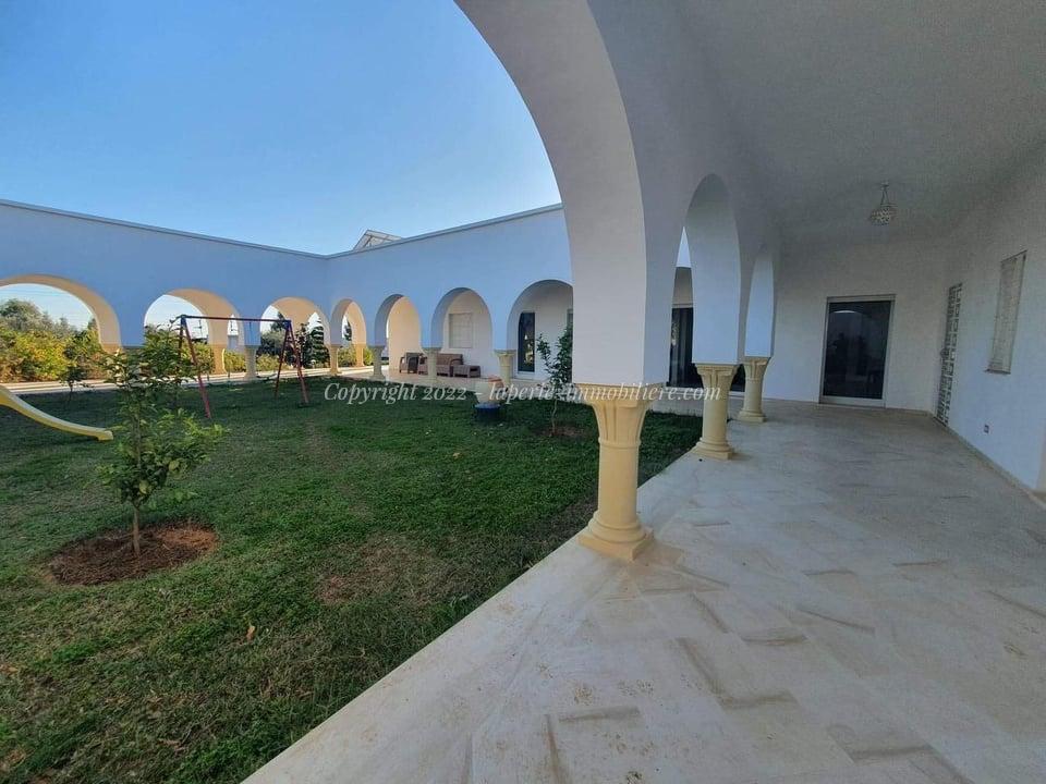 La Perle Immobilière offers a charming villa for sale in Monchar, just 10 minutes from Hammamet, located on the main road with excellent surroundings. This spacious property sits on a 1100 m² plot with 420 m² of living space, featuring two suites, two additional bedrooms, a fully equipped kitchen, two bathrooms with showers, a guest toilet, and a terrace.