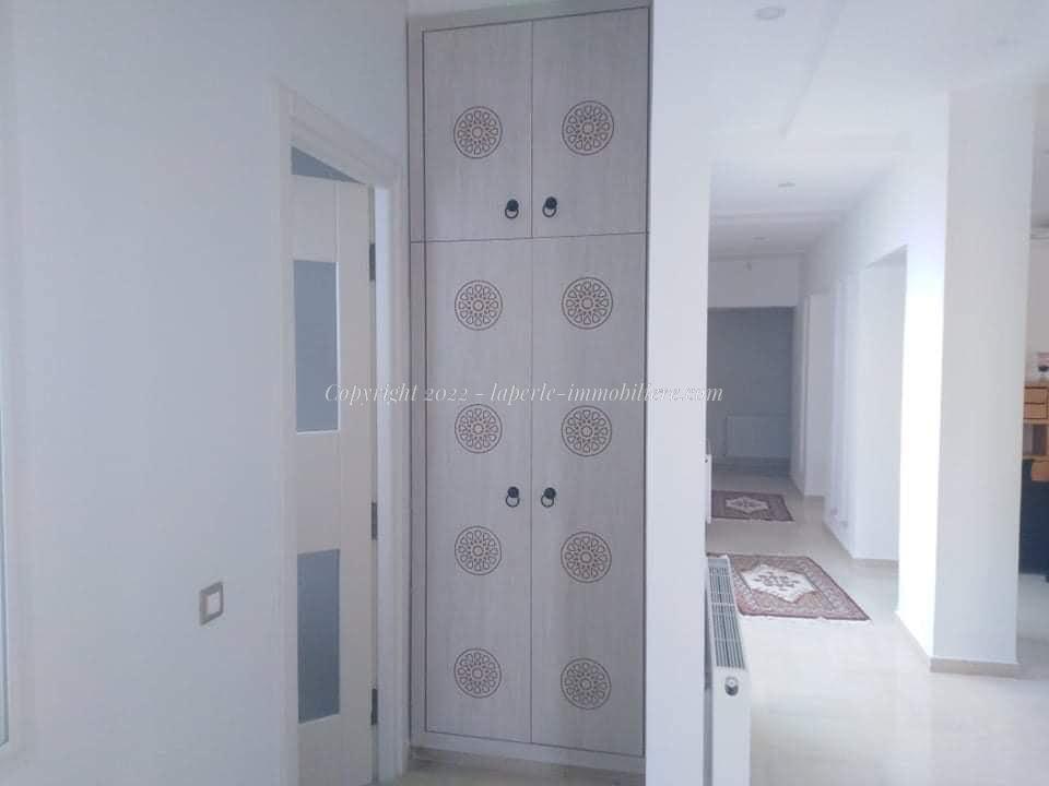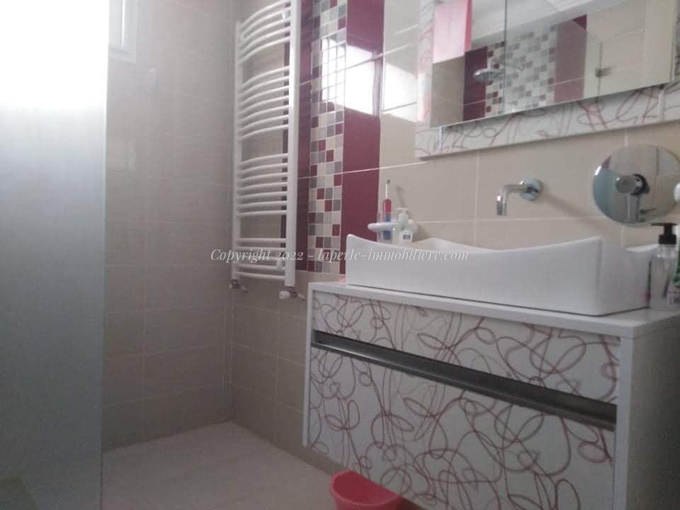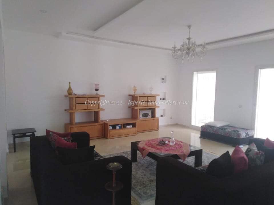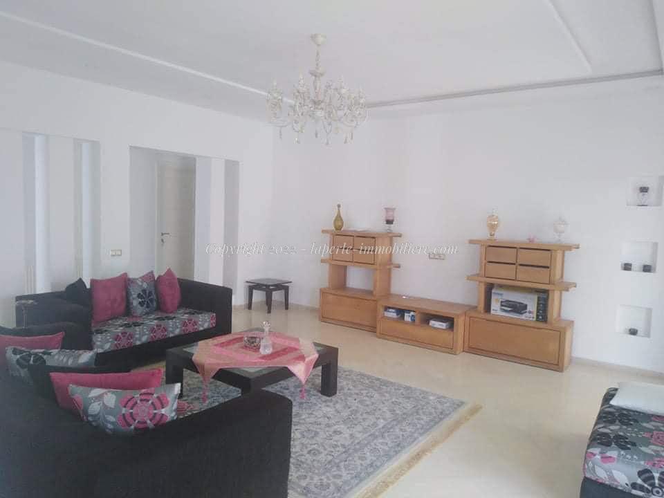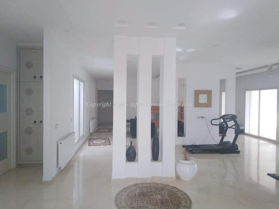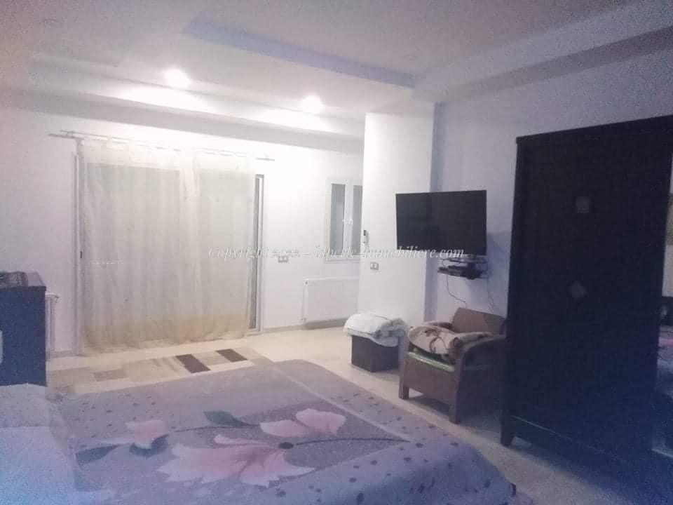 La Perle Immobilière offers a charming villa for sale in Monchar, just 10 minutes from Hammamet, located on the main road with excellent surroundings. This spacious property sits on a 1100 m² plot with 420 m² of living space, featuring two suites, two additional bedrooms, a fully equipped kitchen, two bathrooms with showers, a guest toilet, and a terrace.