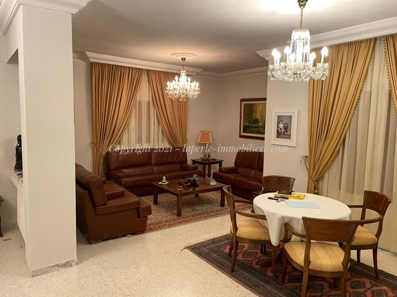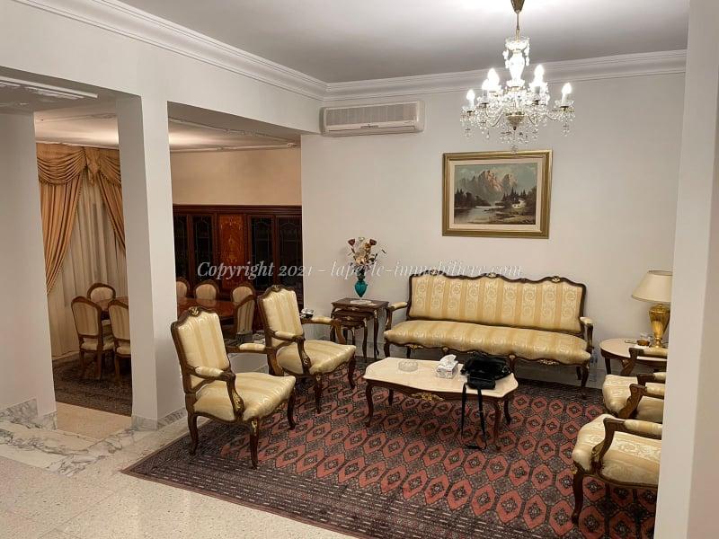 La Perle Immobilière offers an exclusive opportunity to own a luxurious villa for sale in Menzah 9, ideally located with excellent accessibility. Built on a 750 m² plot with 600 m² of living space spread across three levels, this property includes a large, bright living room with garden views, a dining area, a guest bathroom, a fully equipped modern kitchen, and a master suite on the ground floor.