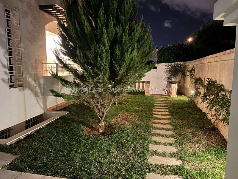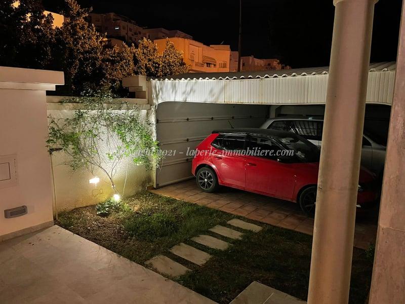 Upstairs, the villa for sale in Menzah 9 features three additional suites, each with its private bathroom and dressing room. An independent studio with separate access provides additional living space. The villa also boasts a beautifully landscaped garden and private parking for up to five vehicles, making it a perfect family home in one of the area’s most sought-after locations.
