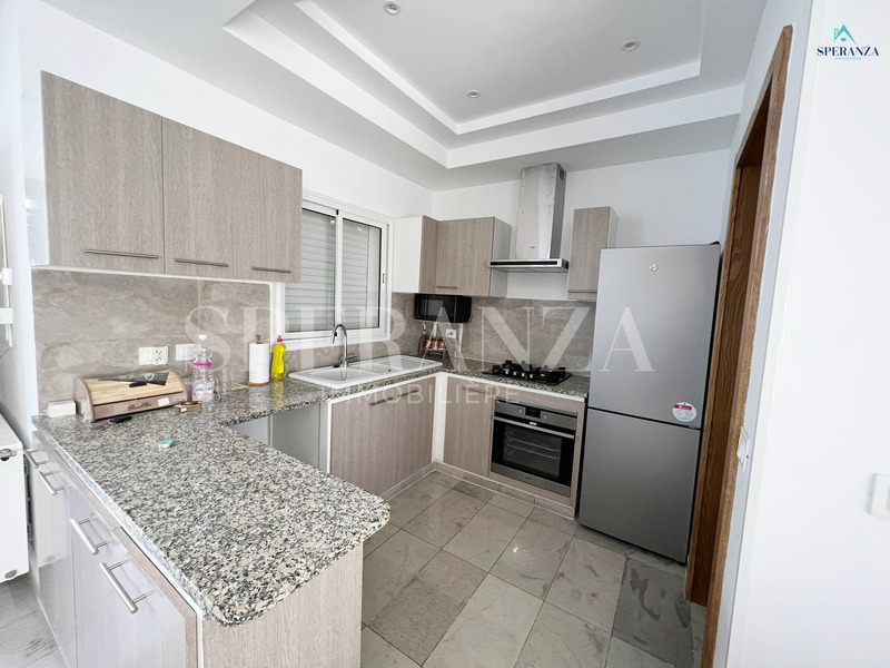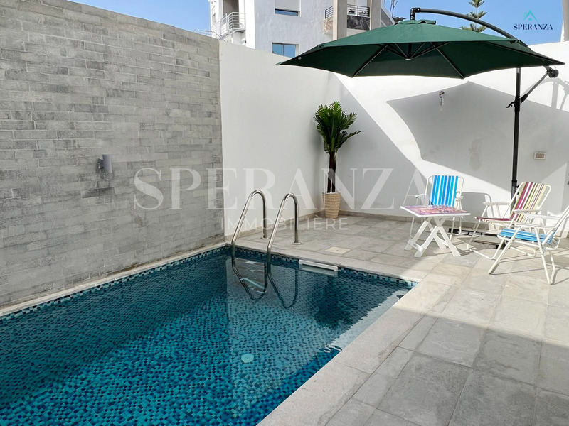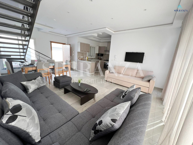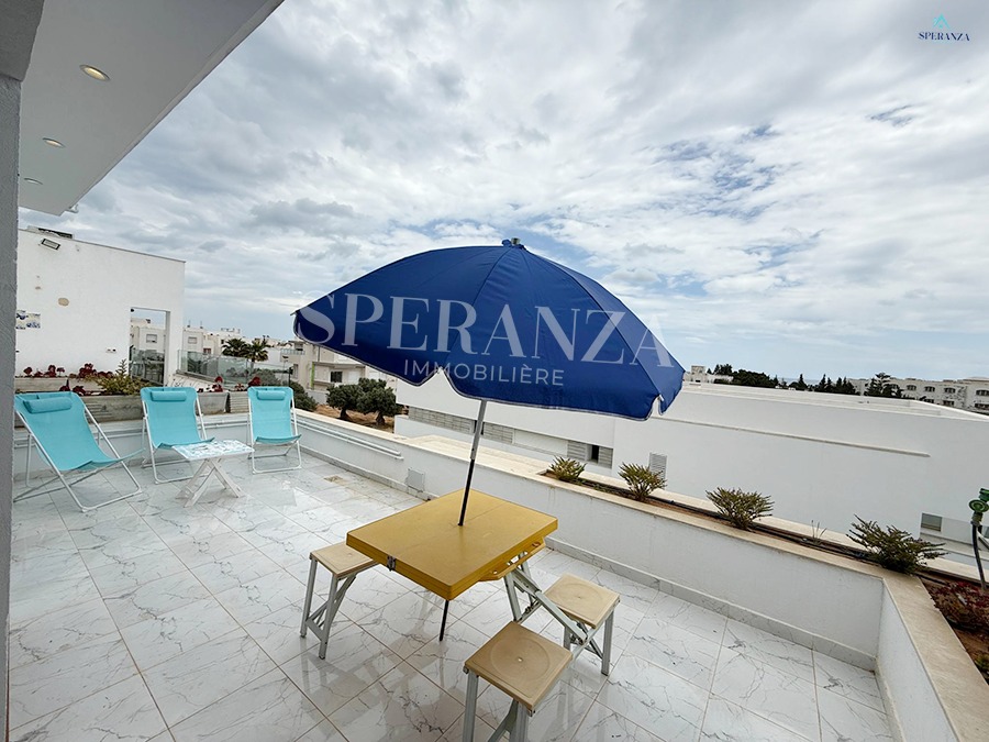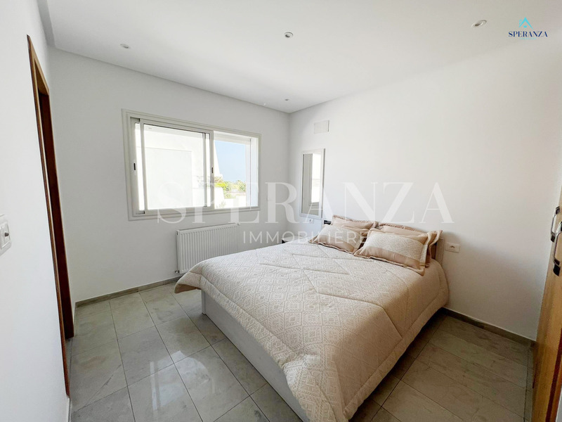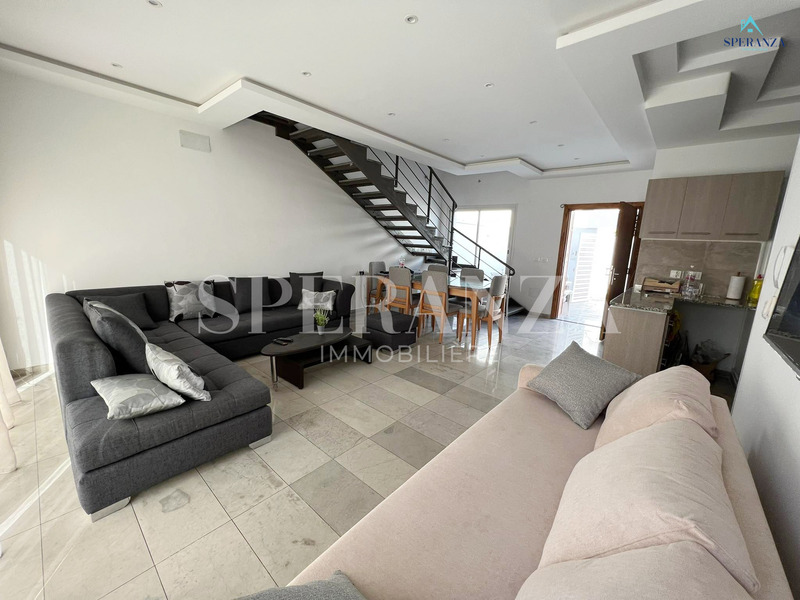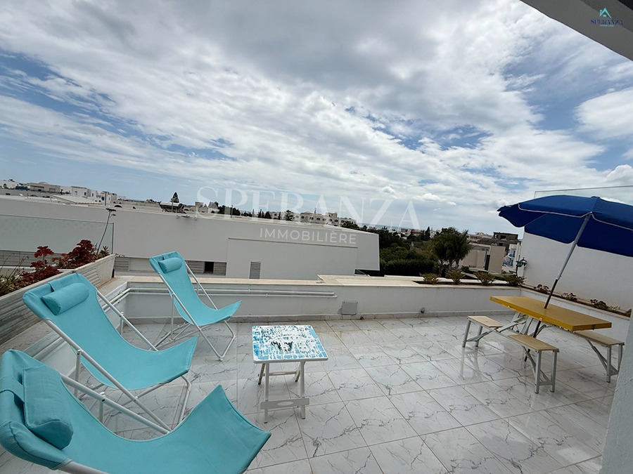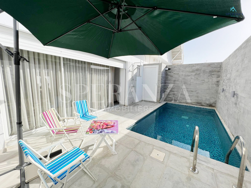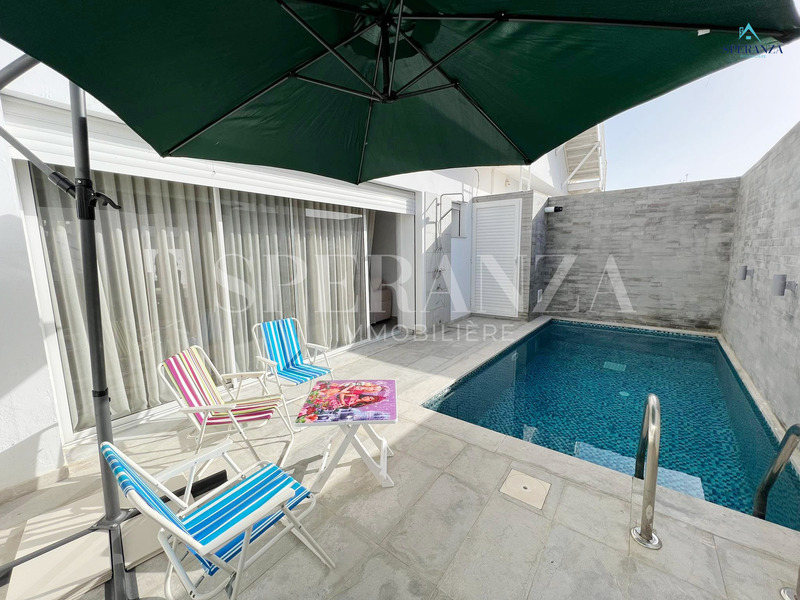 Speranza Immobilière Hammamet offers a lovely S+3 Vacation Villa for Rent in Hammamet Nord with Pool & Sea View, located in a calm, residential area. Spread over two levels with 120 m² of living space, it features a terrace with a private pool, a bright living room, and a well-equipped wooden kitchen. The ground floor also includes a guest bathroom.