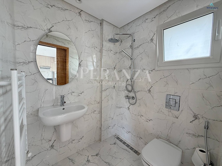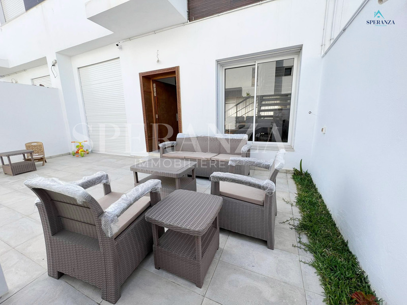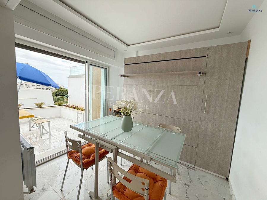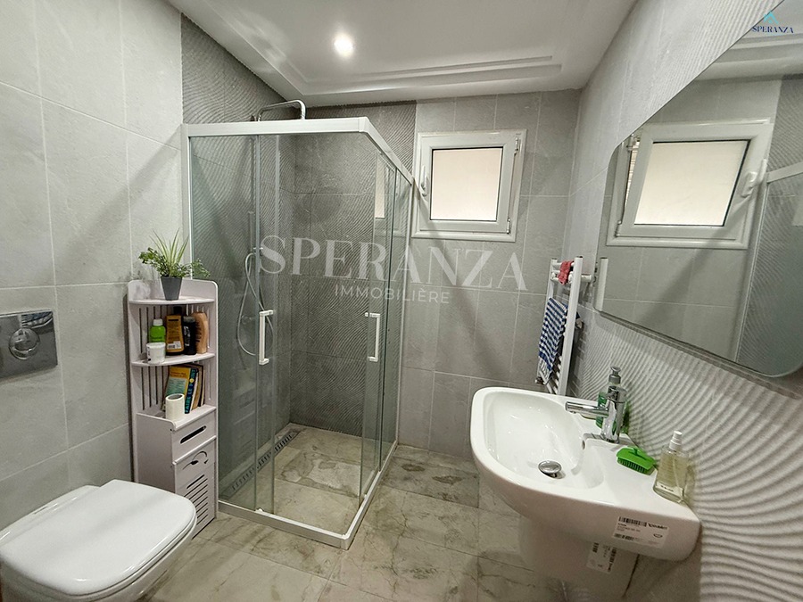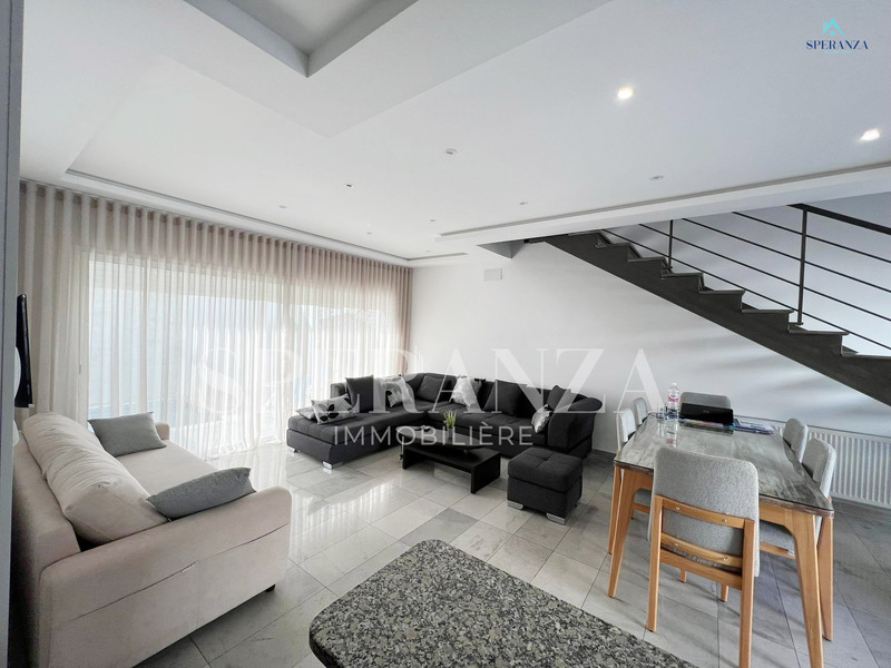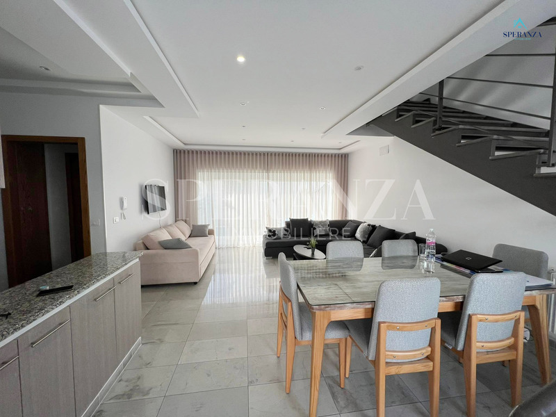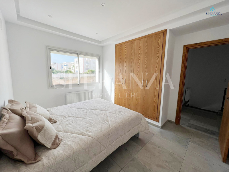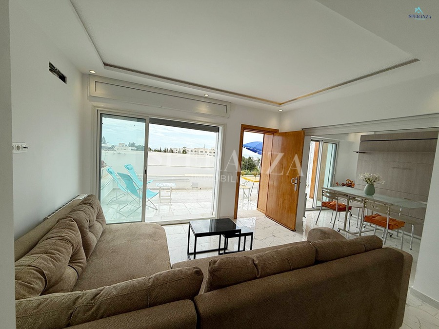 Speranza Immobilière Hammamet offers a lovely S+3 Vacation Villa for Rent in Hammamet Nord with Pool & Sea View, located in a calm, residential area. Spread over two levels with 120 m² of living space, it features a terrace with a private pool, a bright living room, and a well-equipped wooden kitchen. The ground floor also includes a guest bathroom.