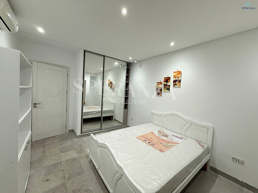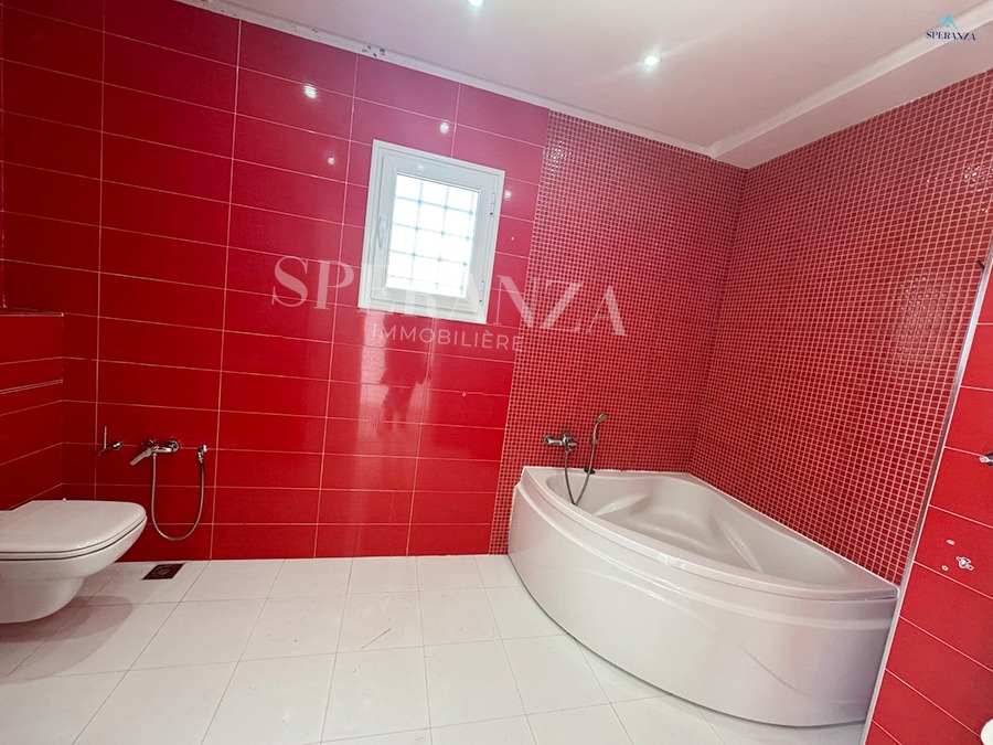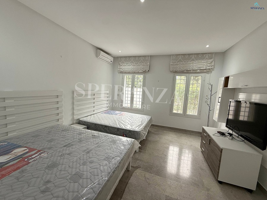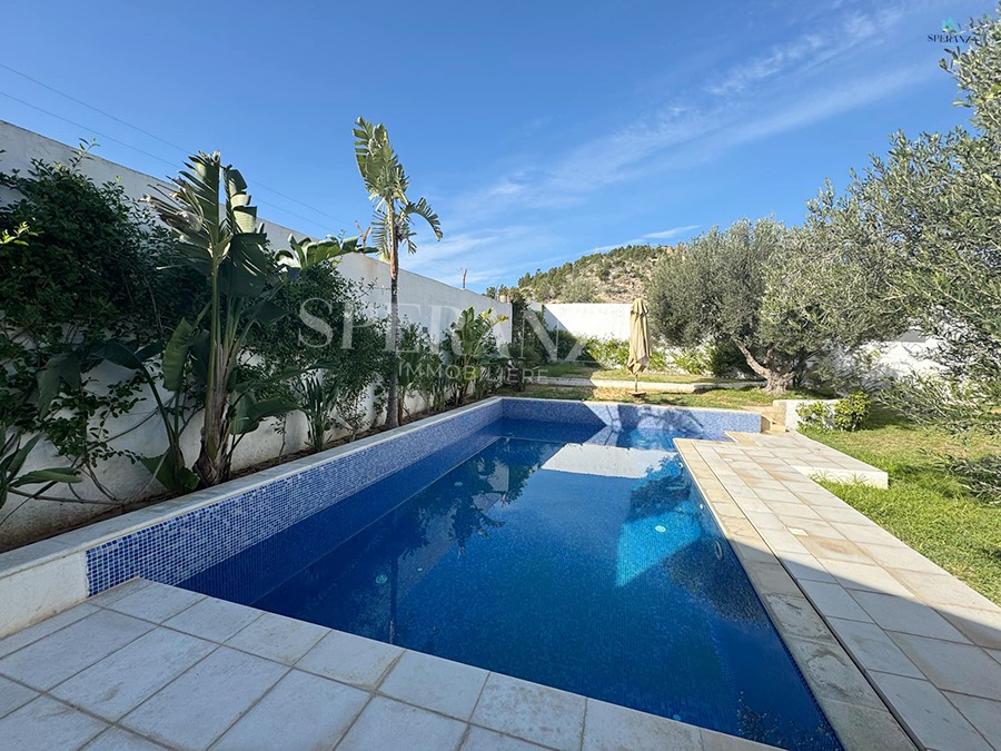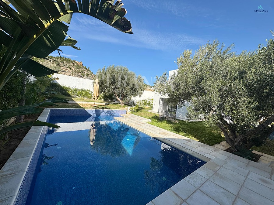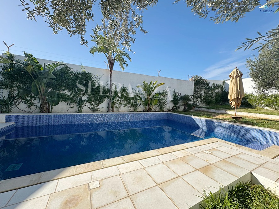 Speranza real estate Hammamet offers you this beautiful S+3 vacation villa for rent in Hammamet Nord, ideally situated in a calm and peaceful neighborhood. The main entrance opens onto a spacious garden with a swimming pool, perfect for relaxation. The ground floor features a bright and spacious living room, a fully equipped kitchen with all necessary storage elements, a bedroom, and a guest bathroom. The villa also includes city gas, central heating, air conditioning, and a TV for added comfort.