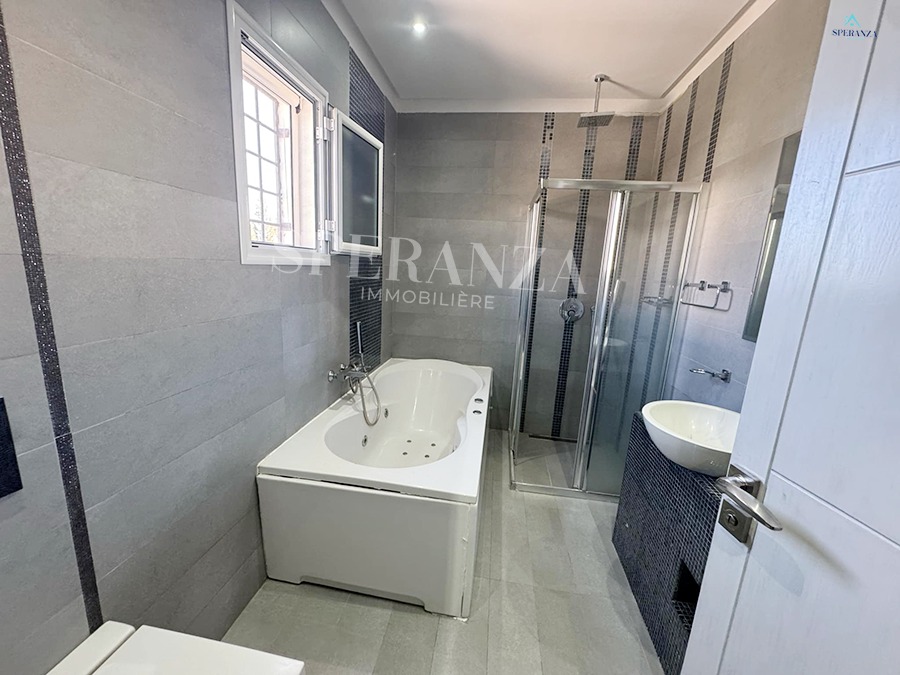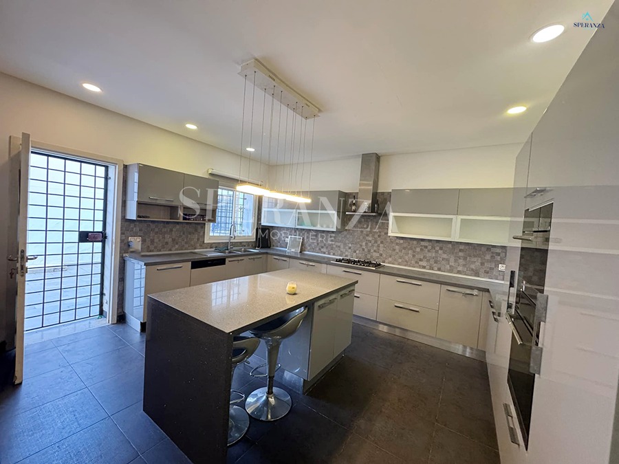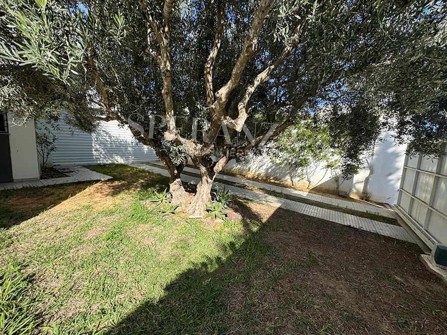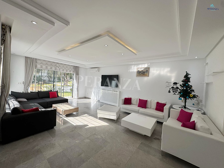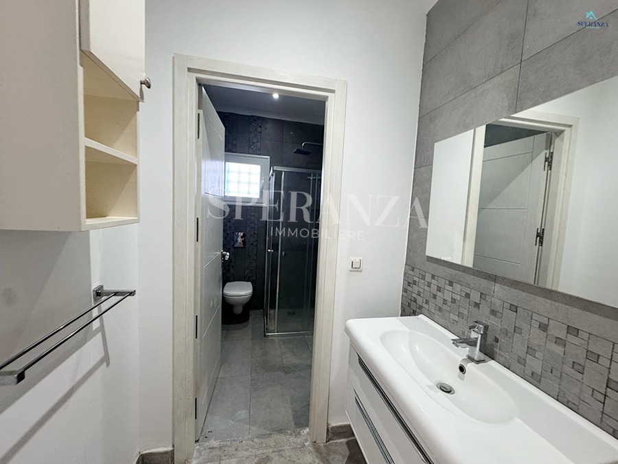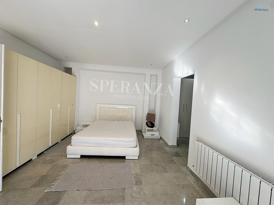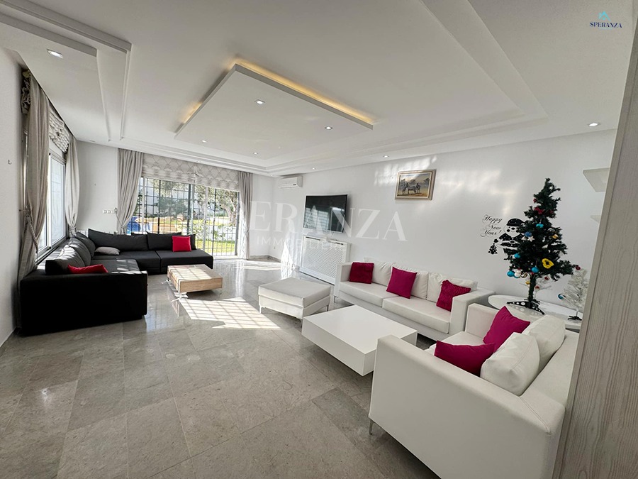 Speranza real estate Hammamet offers you this beautiful S+3 vacation villa for rent in Hammamet Nord, ideally situated in a calm and peaceful neighborhood. The main entrance opens onto a spacious garden with a swimming pool, perfect for relaxation. The ground floor features a bright and spacious living room, a fully equipped kitchen with all necessary storage elements, a bedroom, and a guest bathroom. The villa also includes city gas, central heating, air conditioning, and a TV for added comfort.