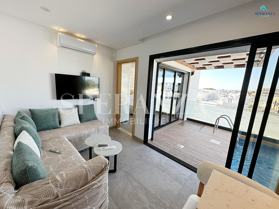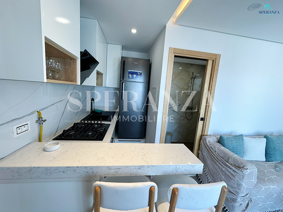 Speranza Immobilière Hammamet offers a cozy S+1 Vacation Apartment Gabriele for Rent in Hammamet Centre, located on the 3rd floor of a secure and peaceful residence. With a living area of 65 m², the apartment features a bright living room, a well-equipped kitchenette, a bedroom, and a modern bathroom.
