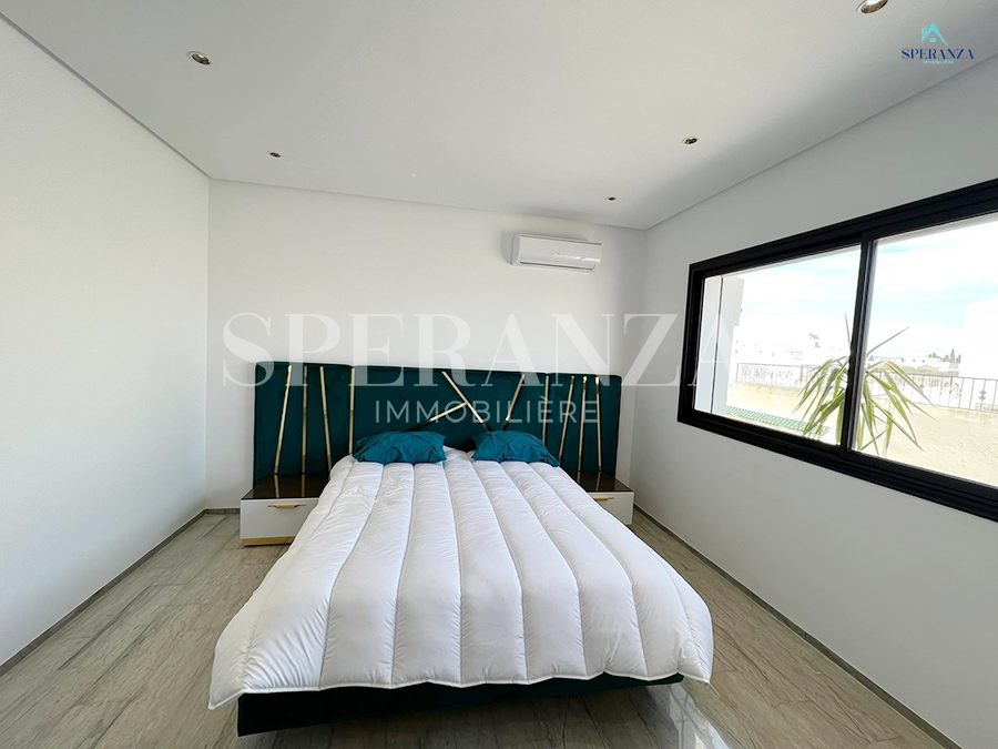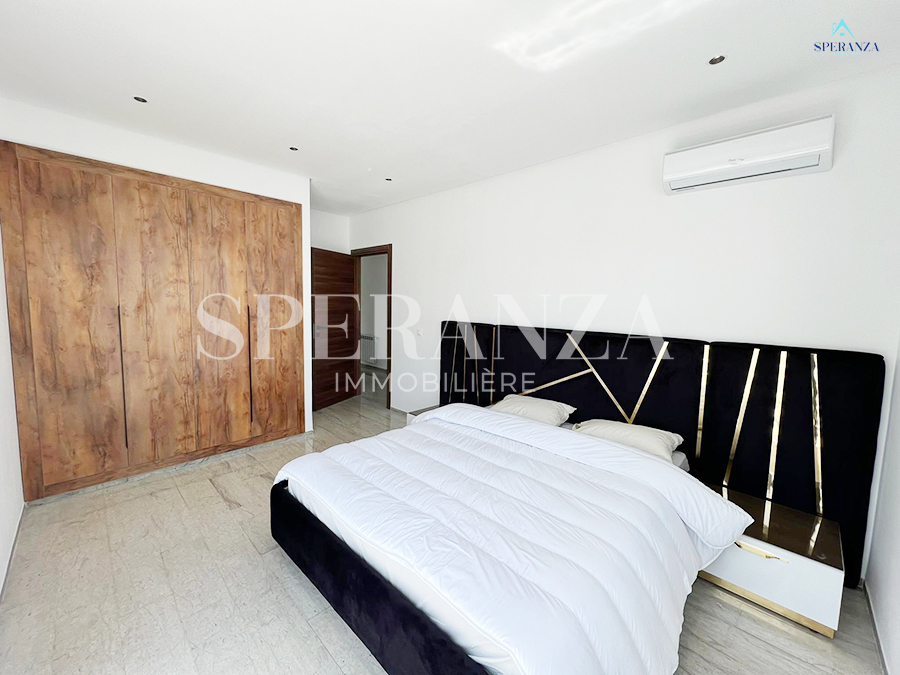 The night area includes two cozy bedrooms, both furnished with dressings and offering direct access to a sunlit terrace. A shared bathroom is also available. With a total surface of 100 m², this vacation apartment combines functionality and comfort in a peaceful setting. For more details about this S+2 Vacation Apartment for Rent in Hammamet, feel free to contact Speranza immobilière Hammamet.