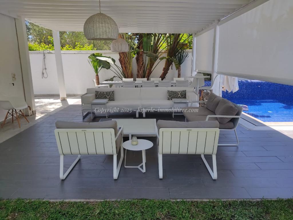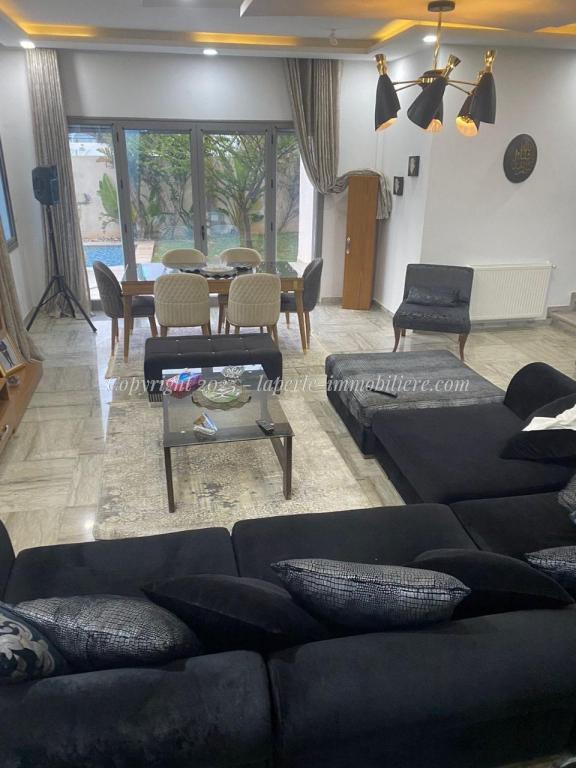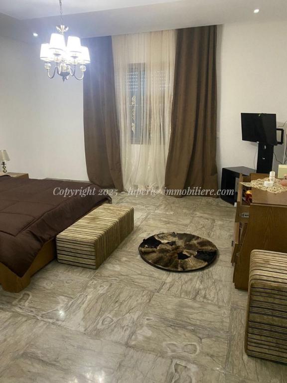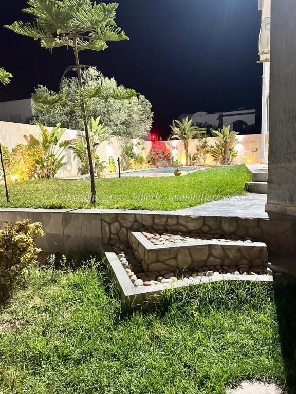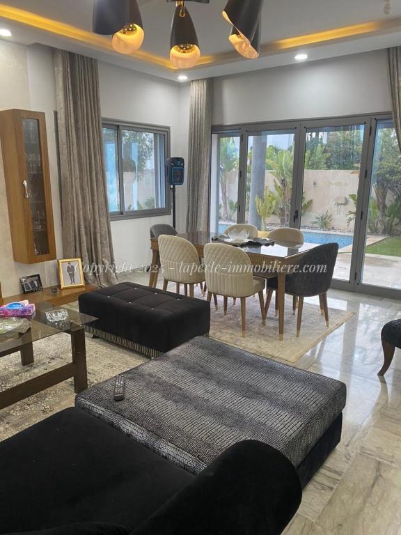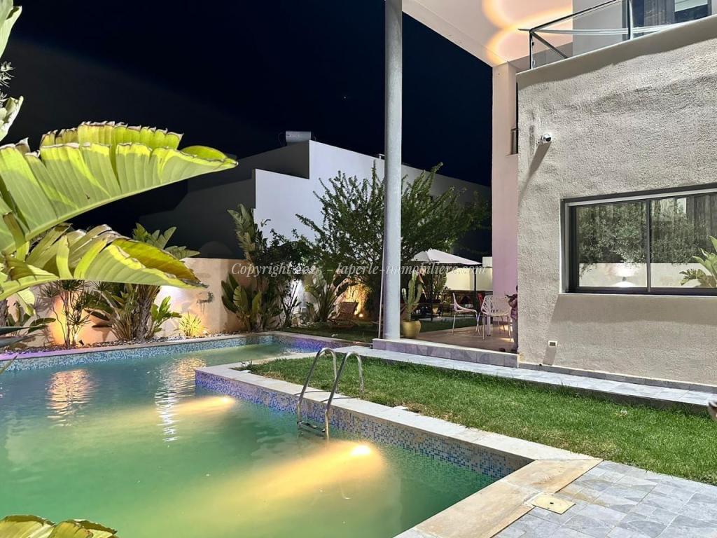 Experience luxury and comfort in this exceptional ground floor villa for sale in Hammamet Sidi Jdid. With 562m² of land and 335m² of living space, this property features three spacious bedrooms, three bathrooms, a large living and dining area, and a fully equipped kitchen. The ground floor also includes a service room and a suite with double dressing and private bath. Outside, enjoy a private pool (8x10m), a relaxation area, a barbecue space, and a garage.