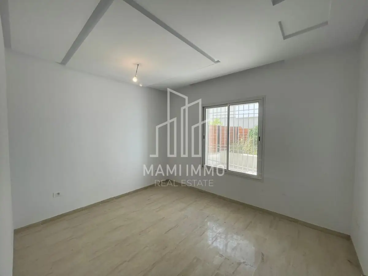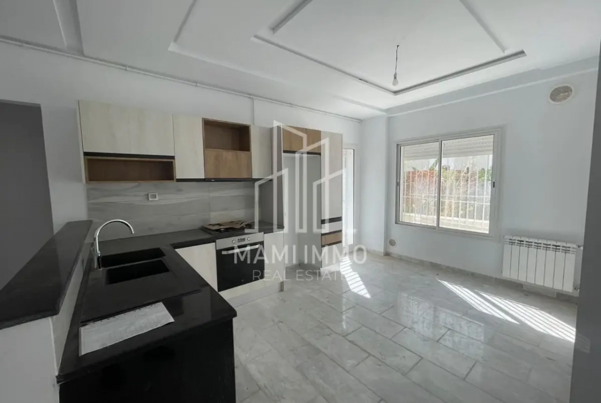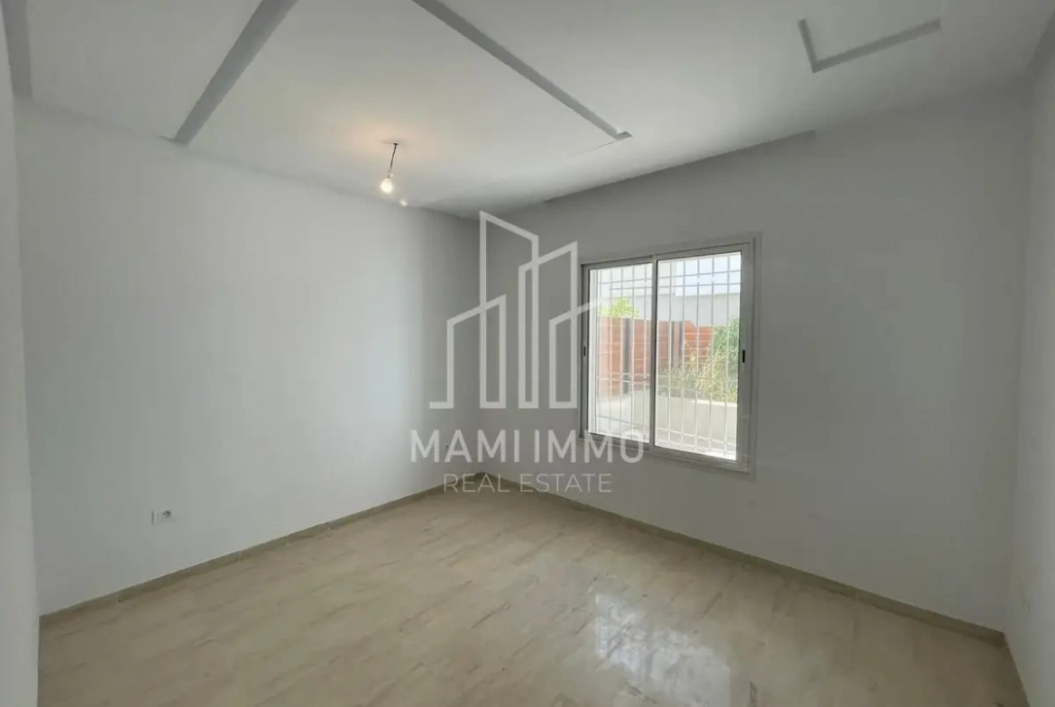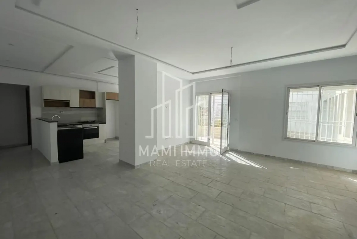 Mami Immo presents a beautiful ground floor apartment for sale in La Soukra. This spacious apartment for sale in La Soukra offers 114 m² of living space with a well-equipped open kitchen and two bedrooms sharing a common bathroom. The property also includes a lovely garden and a large terrace measuring 63.5 m², perfect for outdoor relaxation and entertainment.