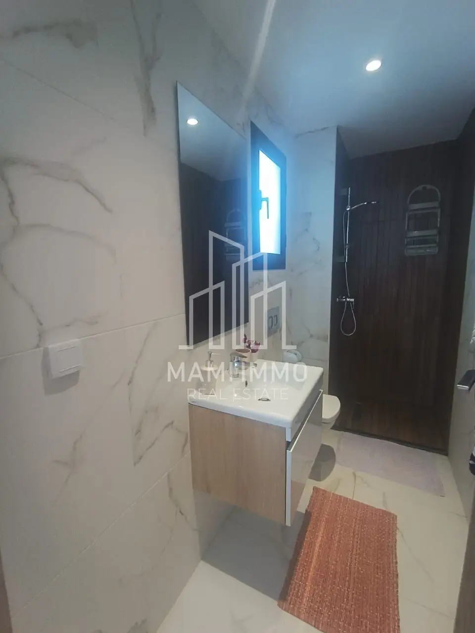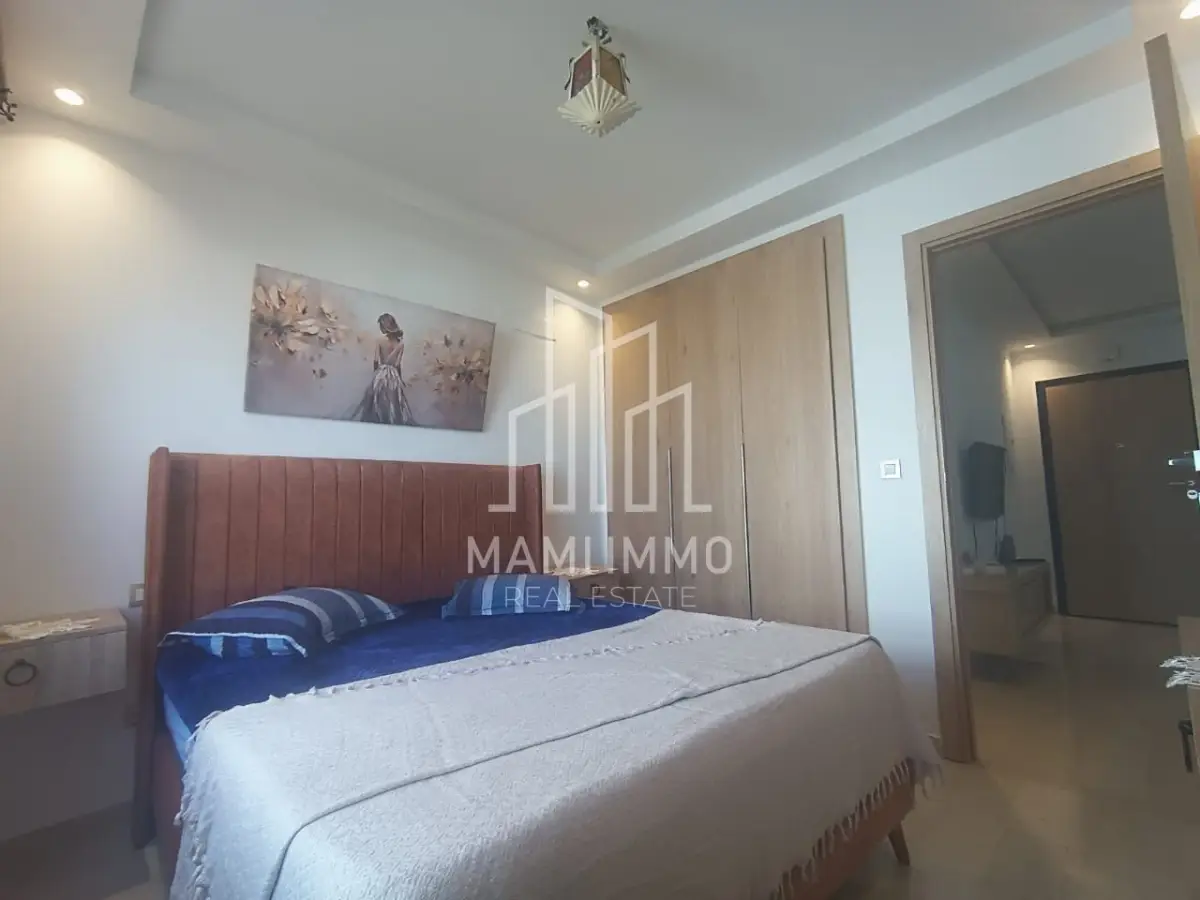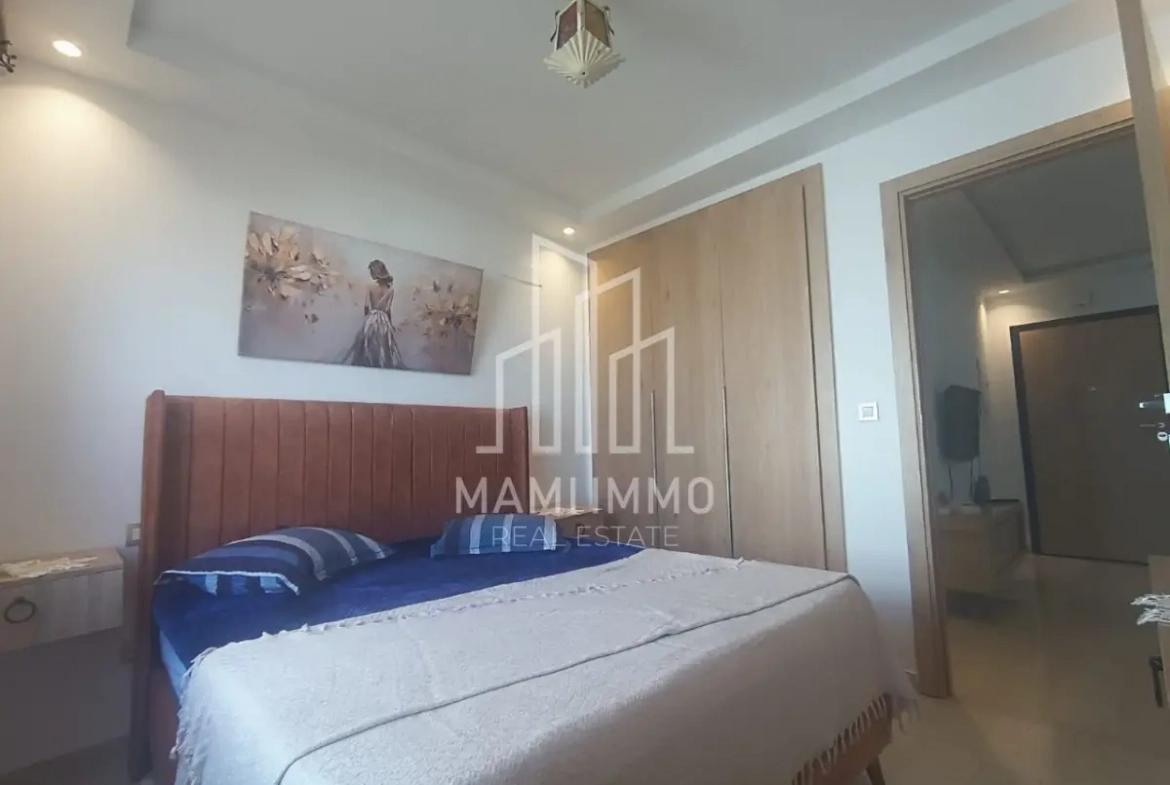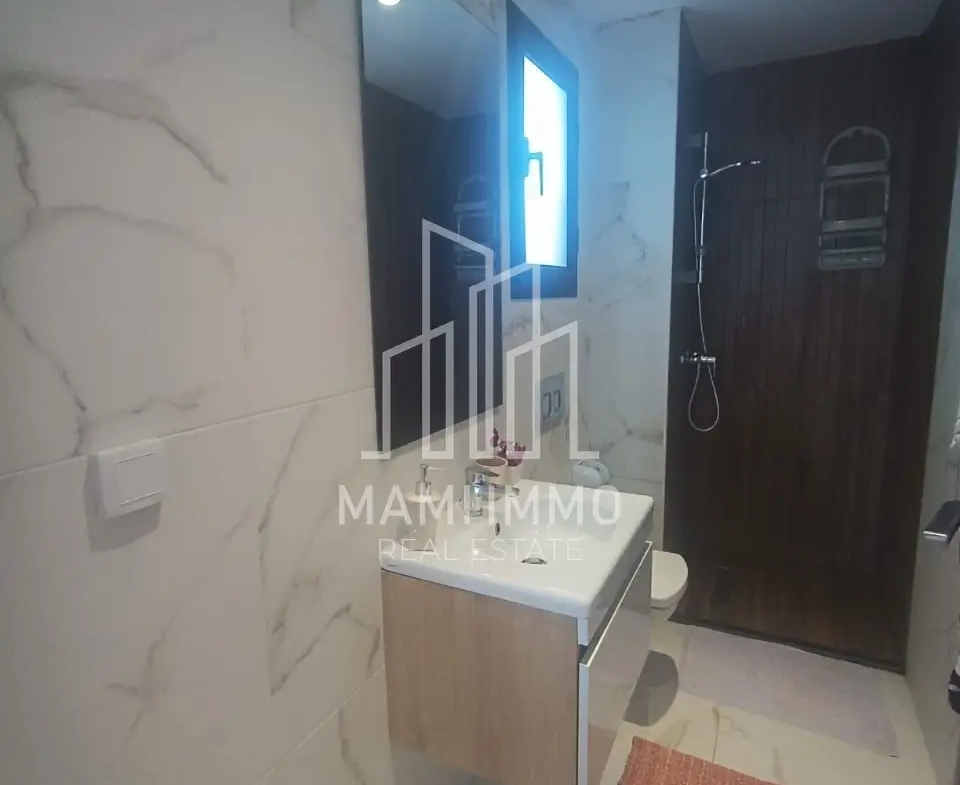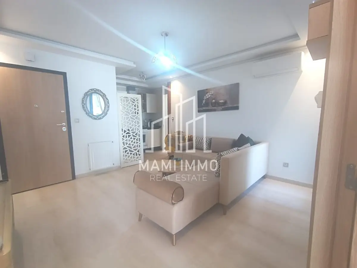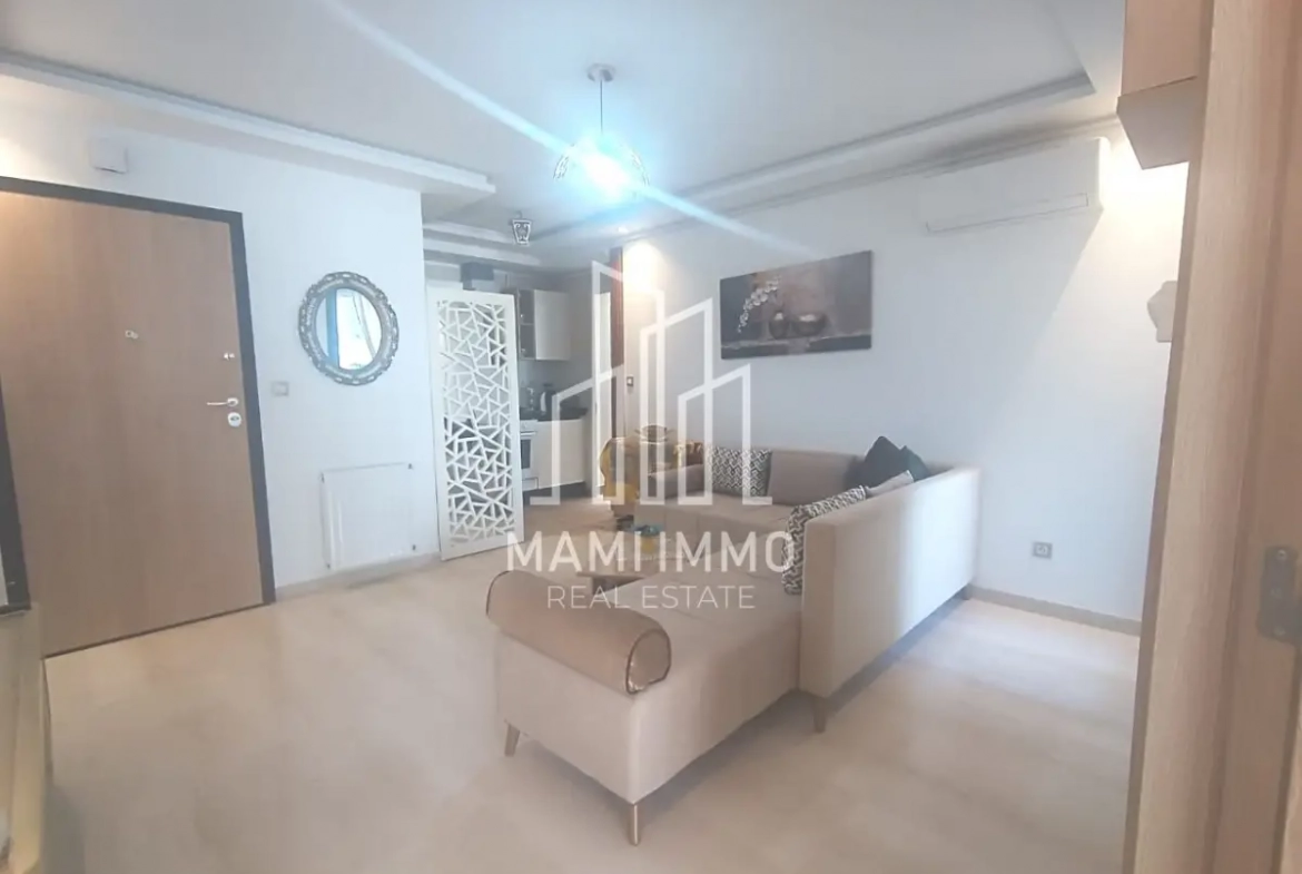 Mami Immo Real Estate offers a comfortable furnished apartment for rent in Bhar Lazreg, located in the popular area of La Marsa. This S+1 apartment is ideal for individuals or couples, featuring a bright living room, a fully equipped kitchen, a balcony, a shower room, and a bedroom with dressing space.