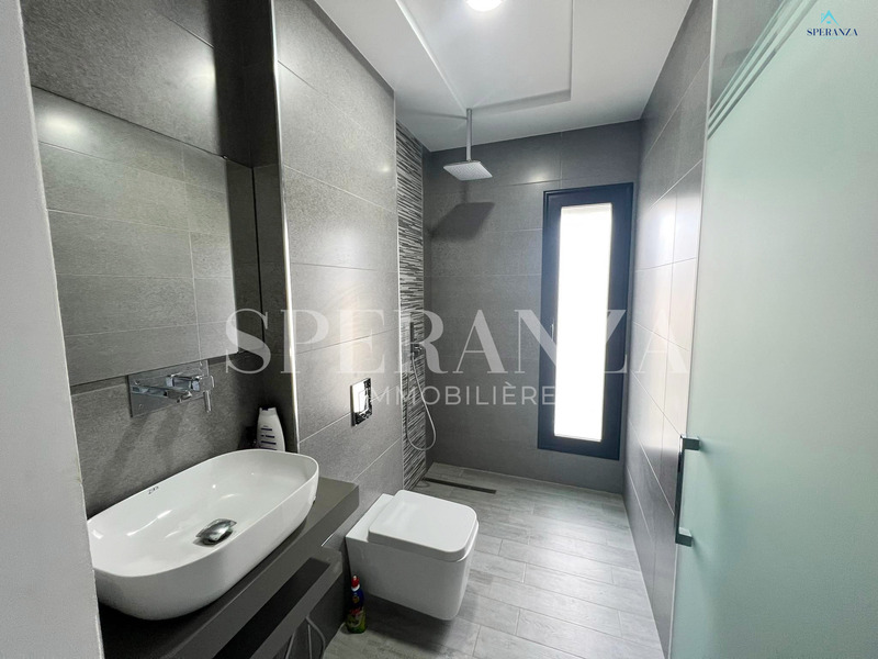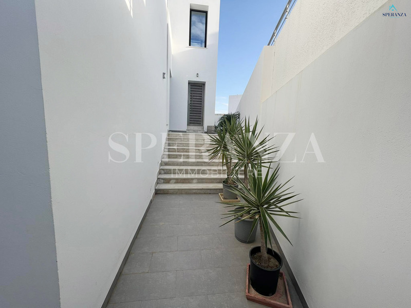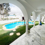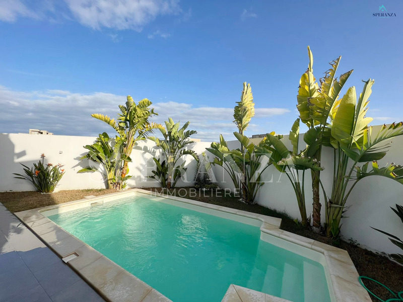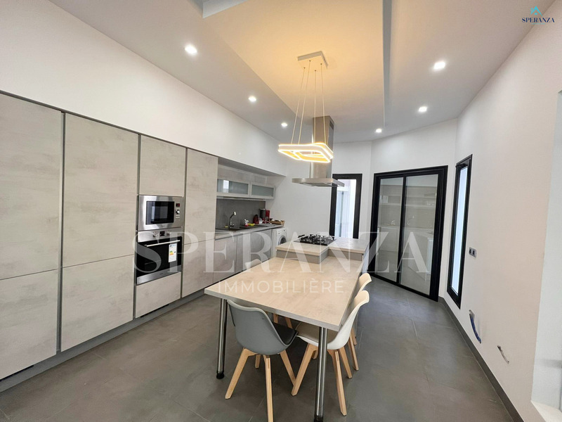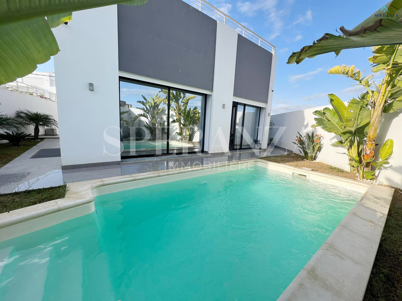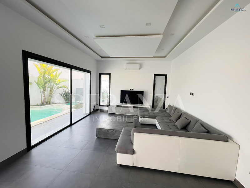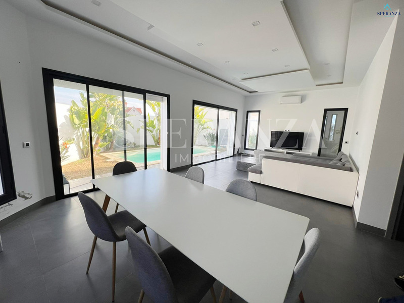Speranza Real Estate Hammamet presents the stylish S+3 Vacation Villa Aline for Rent in Maamoura, Nabeul, located in a secure neighborhood close to local amenities. This fully furnished modern villa features a lush private garden and a swimming pool perfect for summer relaxation. The day area includes a bright living room, a dining space, a guest bathroom, and a fully equipped kitchen with ample storage. A large terrace extends the living space outdoors.