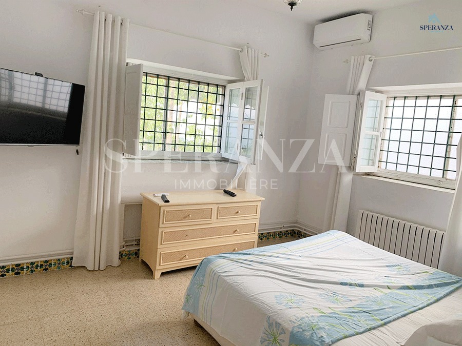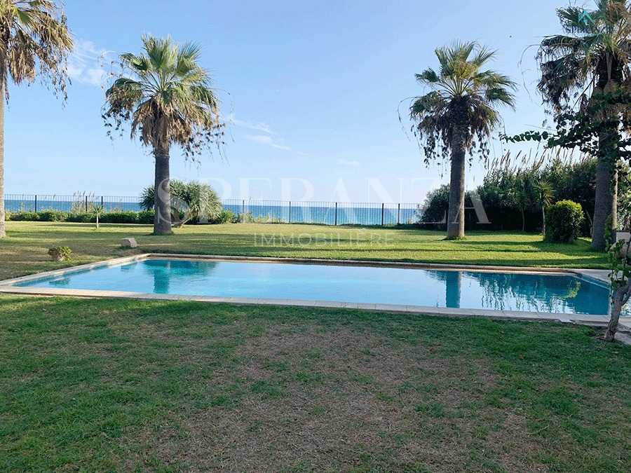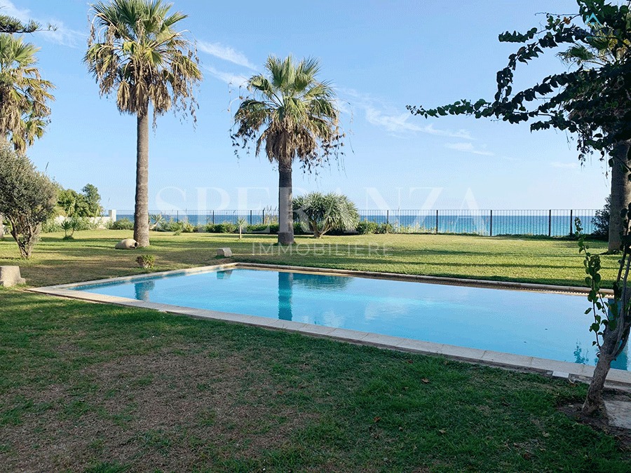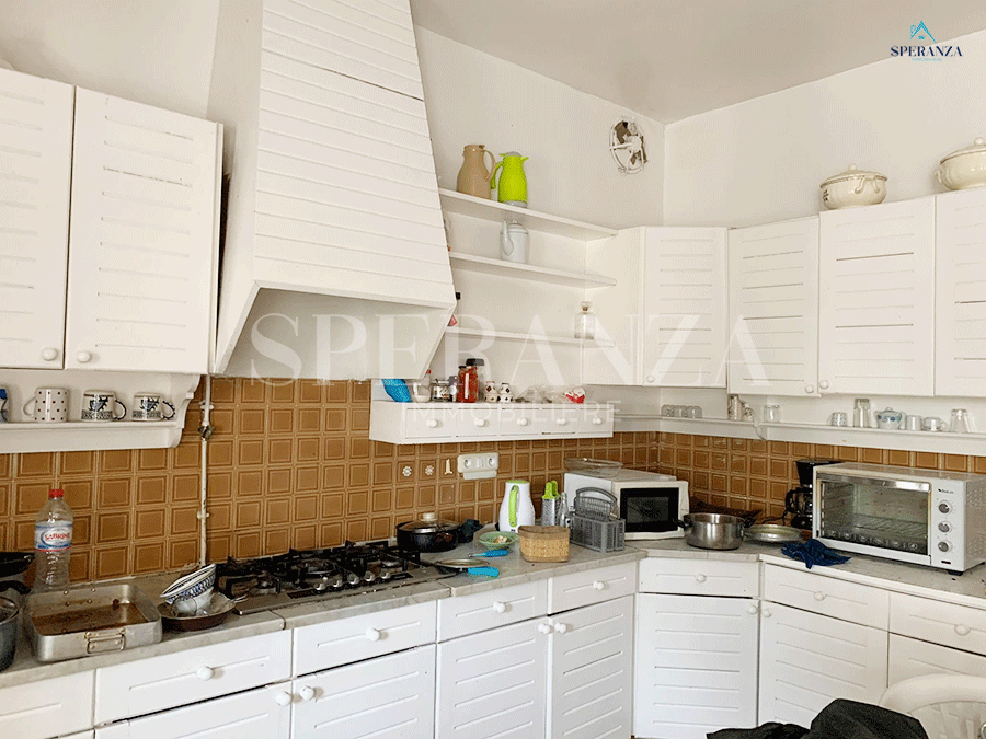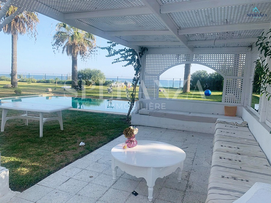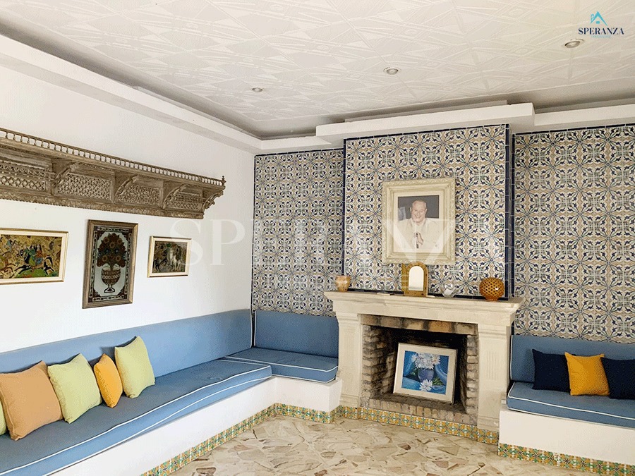 Speranza Immobilière Hammamet offers a beautiful S+4 Seafront Vacation Villa Coral for Rent in Nabeul Mahersi, located right on the water in a calm and scenic area. The villa boasts a total area of 200 m² and an exceptionally large living space of 1,500 m², with a landscaped garden and a private pool offering panoramic sea views. The day area features a bright living room, an additional sitting area, a shared guest bathroom, and a fully equipped kitchen with plenty of storage.