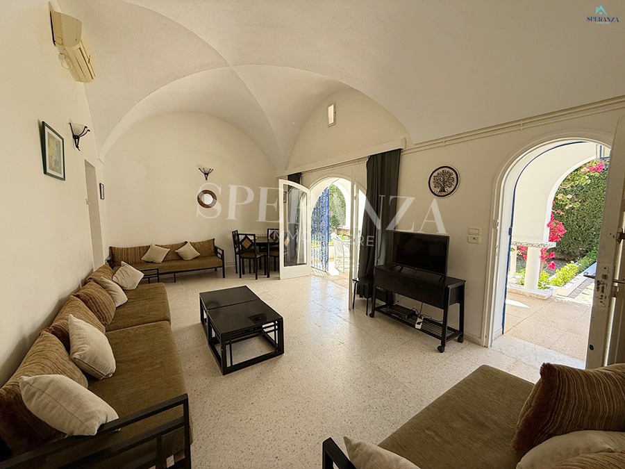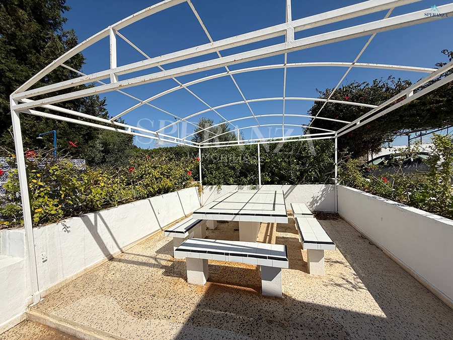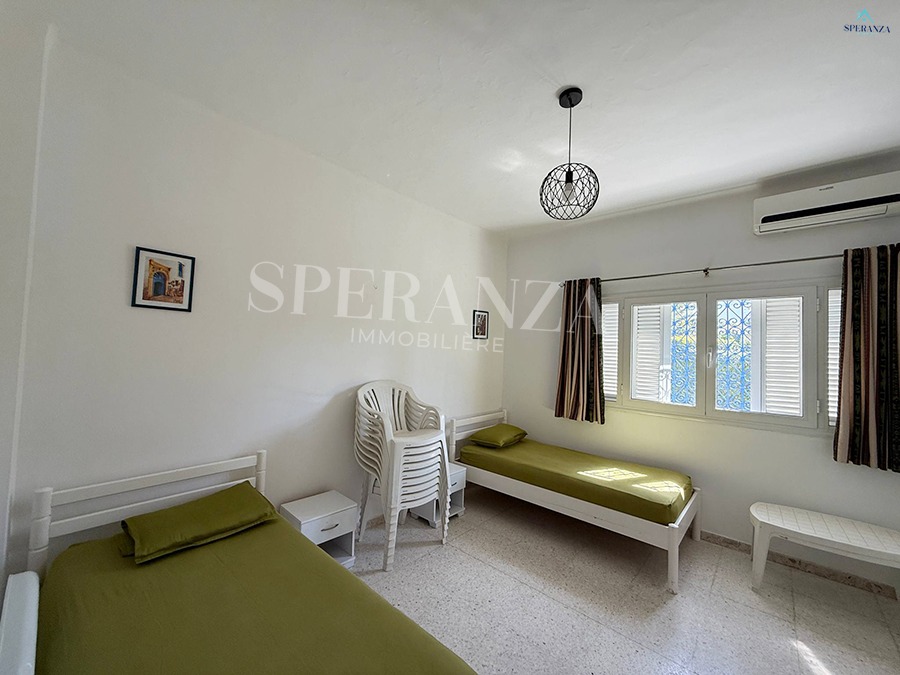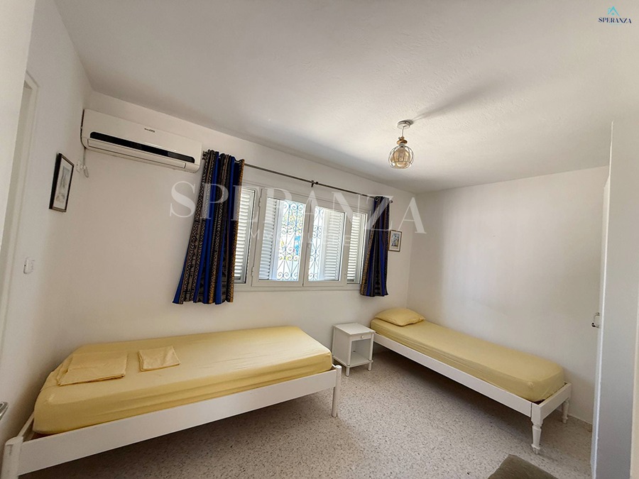 The sleeping area includes two master suites, two additional bedrooms, and a shared bathroom, along with a terrace for relaxing. With city gas, heating, air conditioning, and a peaceful setting near the sea, this S+4 Vacation Villa for Rent in Nabeul with Garden is ideal for family holidays. Price varies by season. For more information, contact Speranza Real Estate at ☎️ 23555199 / 50552450 / 51970200
