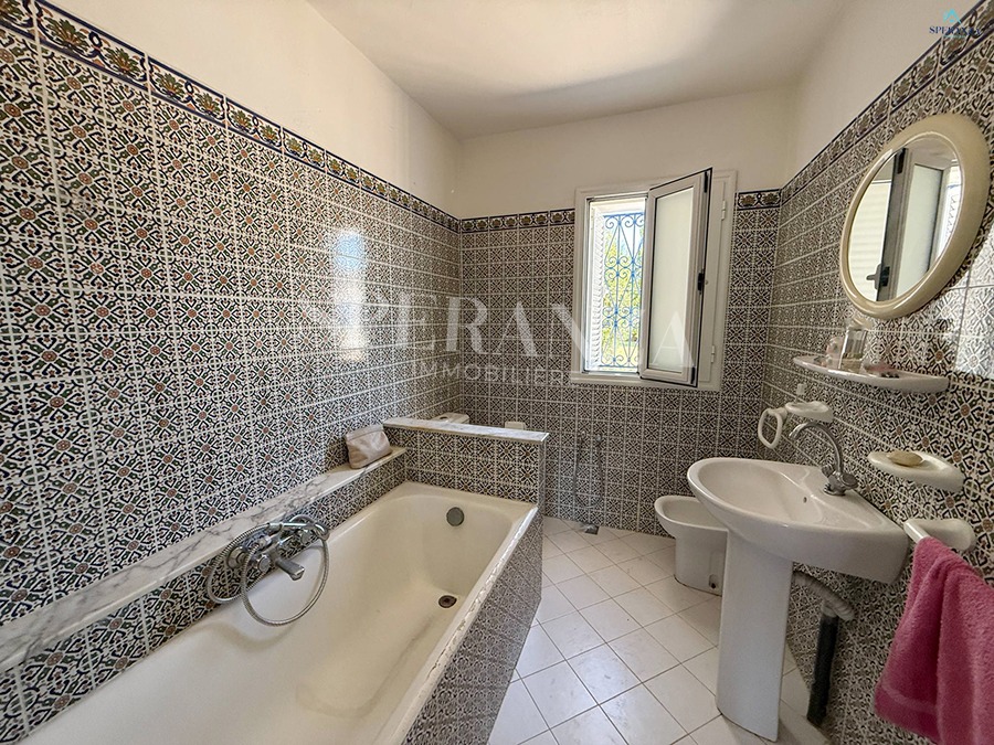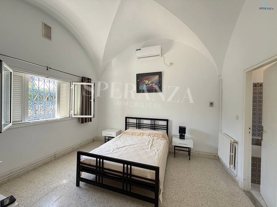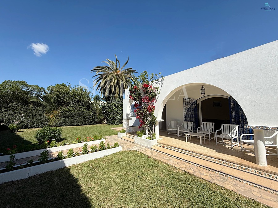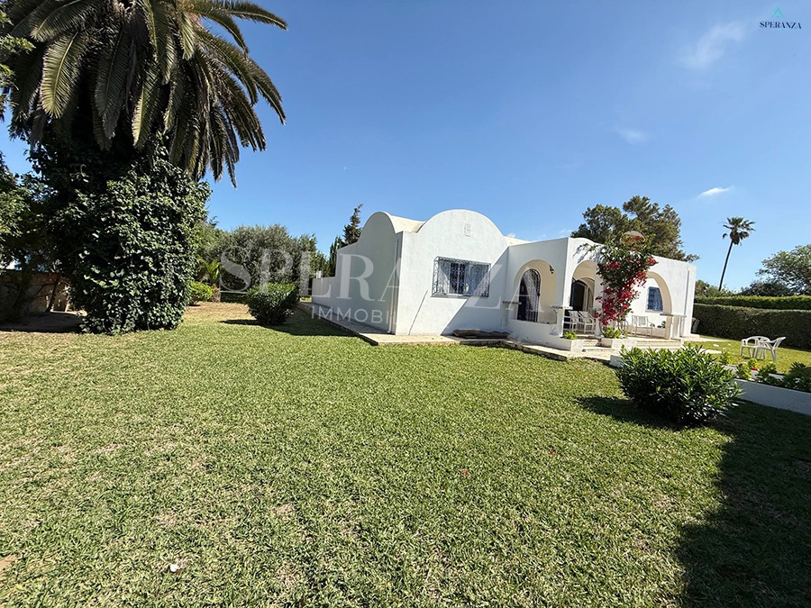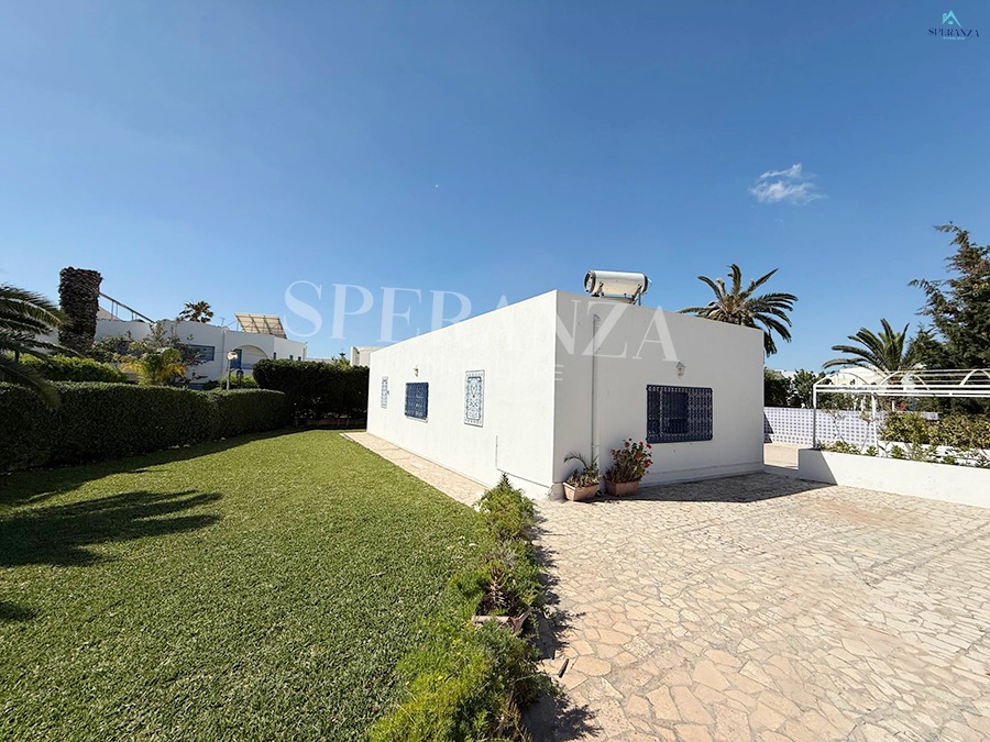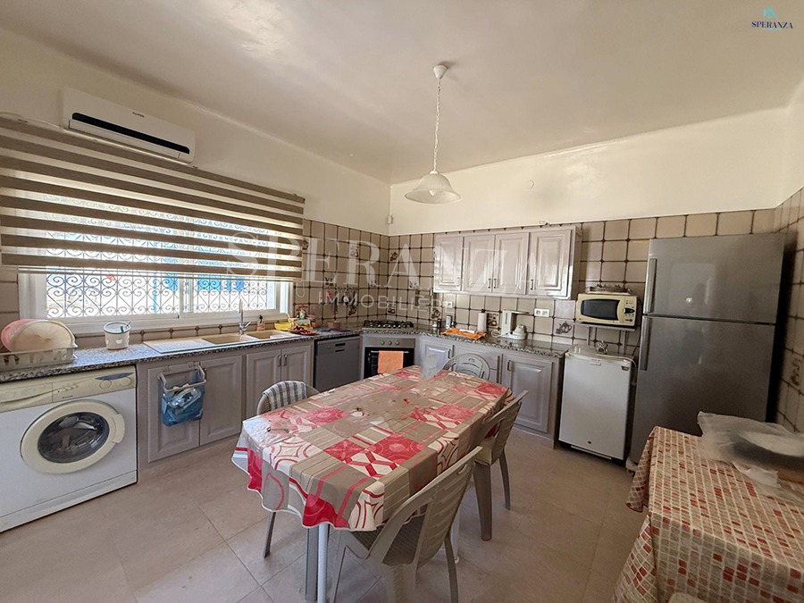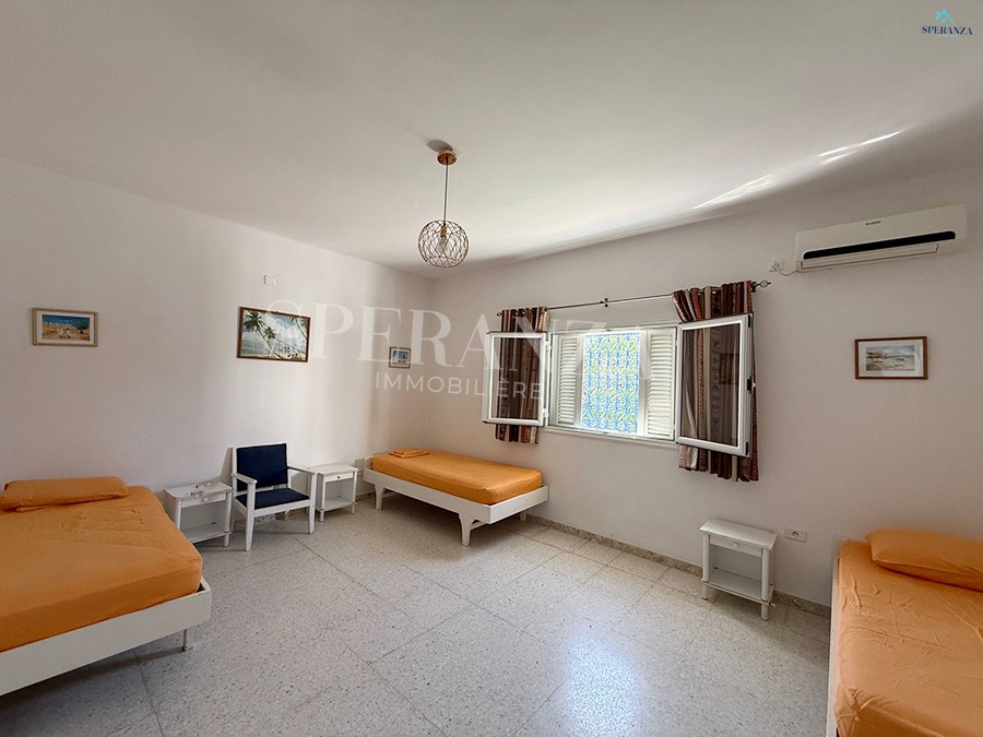 Speranza Immobilière Hammamet presents a spacious S+4 Vacation Villa for Rent in Nabeul with Garden, just a 5-minute walk from the beach. Located in a quiet and secure neighborhood, this villa offers 650 m² of total space and 400 m² of living area. The entrance opens onto a large private garden, leading to a bright and spacious living room and a fully equipped kitchen.