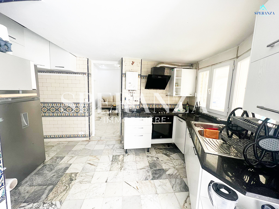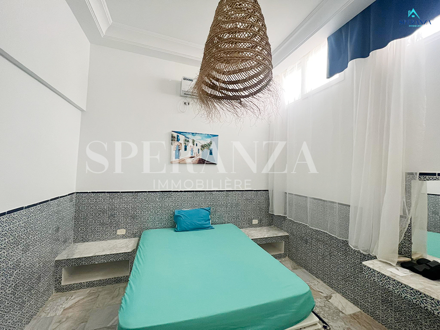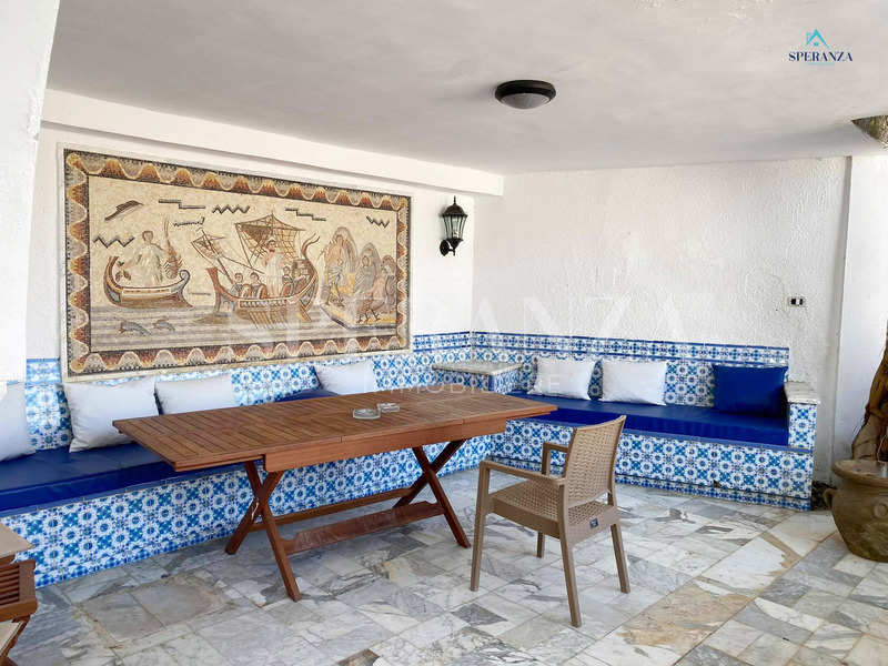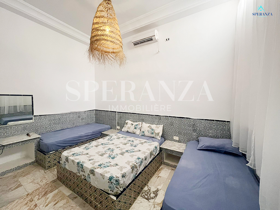 The sleeping area consists of four well-sized bedrooms with built-in wardrobes and a shared bathroom. Additional highlights include a generous terrace, an outdoor shower, and a covered carport. Equipped with city gas, central heating, and air conditioning, this S+4 Vacation Villa Scabieuse for Rent in Nabeul ensures a comfortable and enjoyable holiday experience. Price varies depending on the season. For more information, contact Speranza Real Estate at ☎️ 23555199 / 50552450 / 51970200.